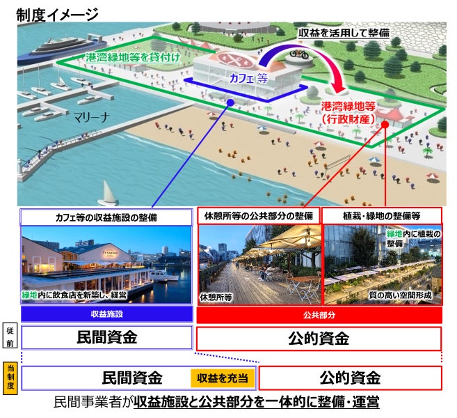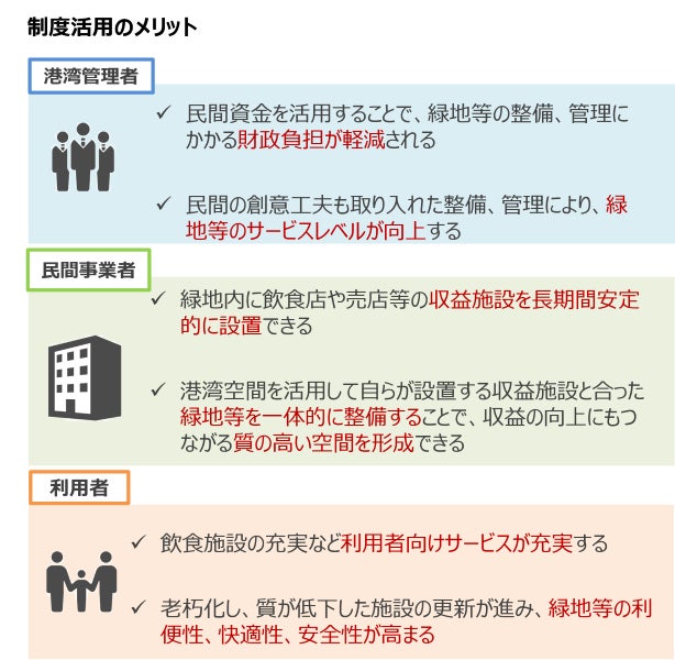 令和4年12月に、官民連携によりみなとの賑わい空間を創出するための制度として、港湾緑地等において、カフェ等の収益施設の整備と収益の一部を還元して緑地等のリニューアルや維持管理を行う民間事業者に対し、緑地等の行政財産の長期貸付け(概ね30年以内)を可能とする認定制度(みなと緑地PPP)が創設された。