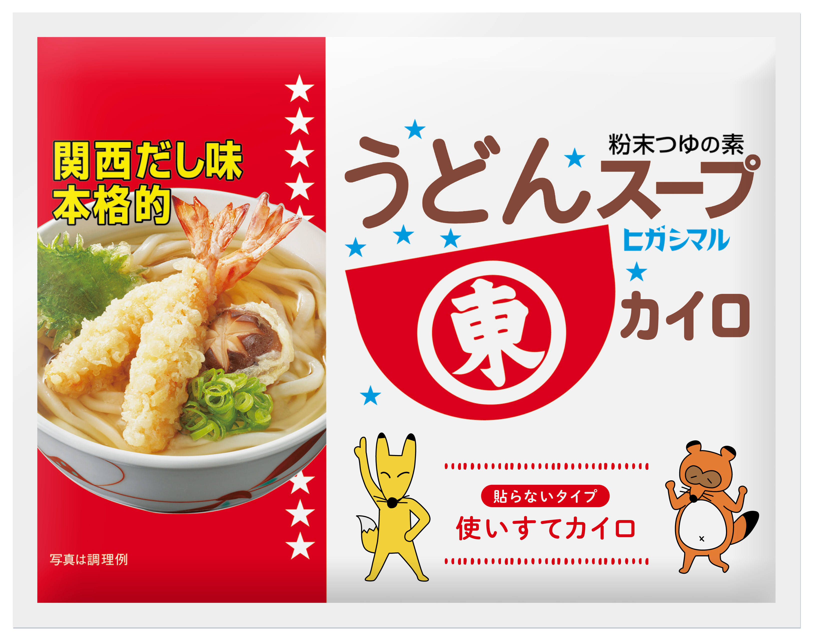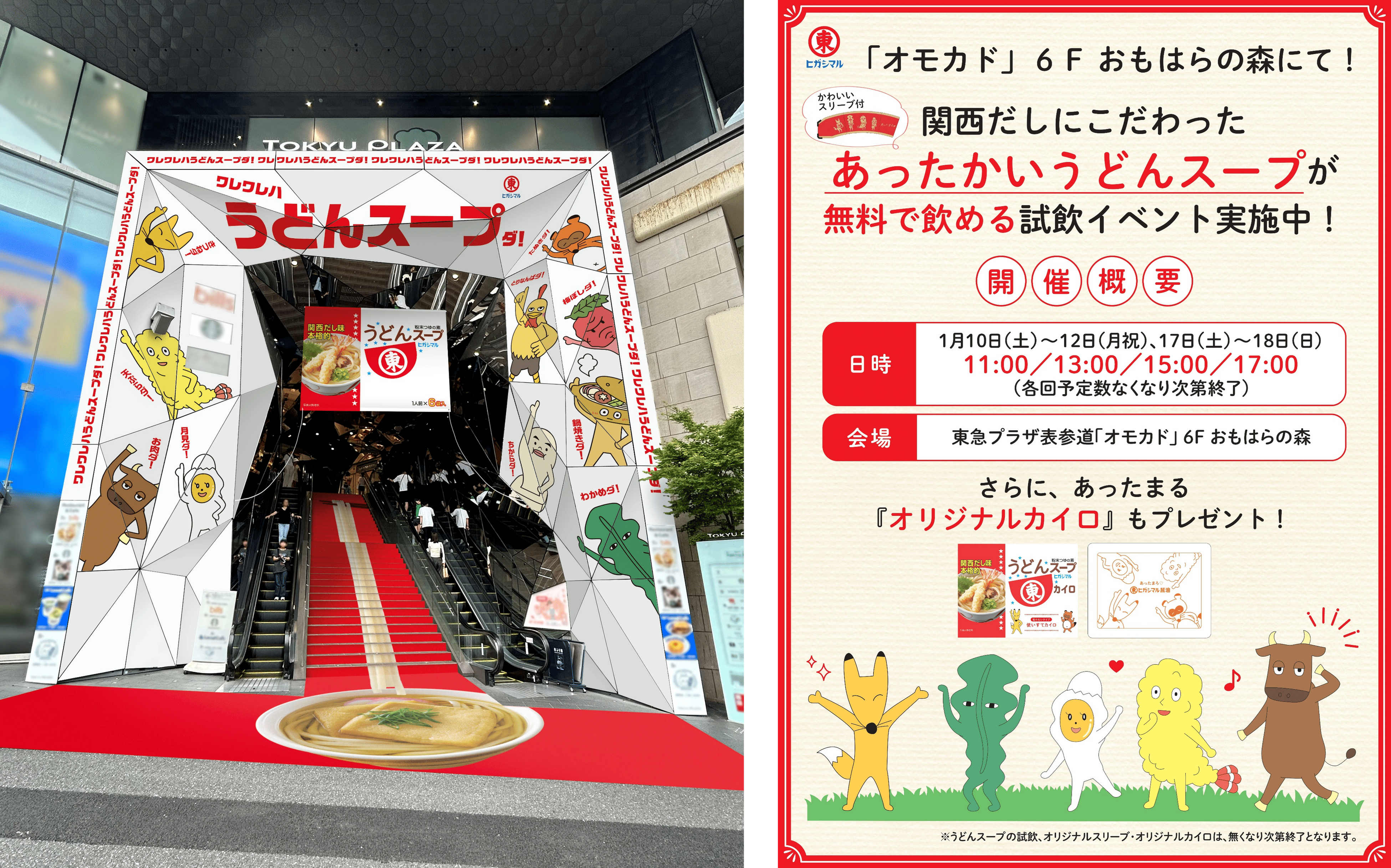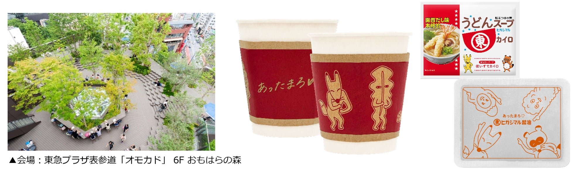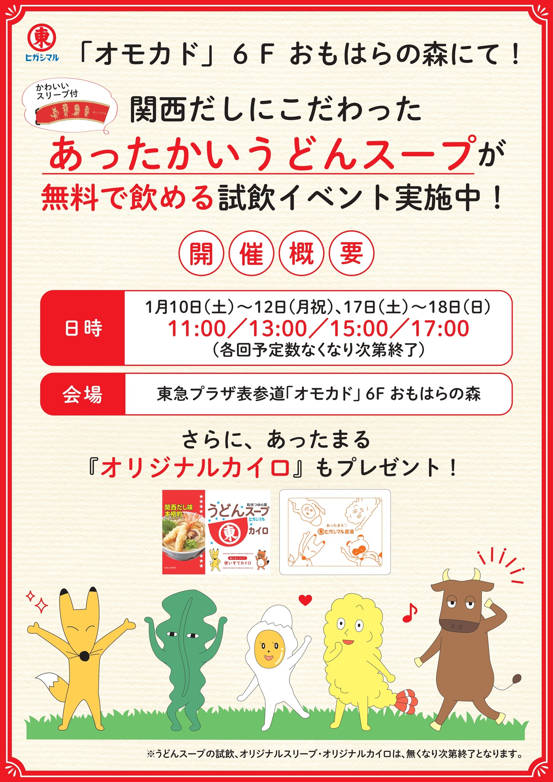 上記は、東急プラザ表参道「オモカド」6F「おもはらの森」にて開催し、各日限定( 1日4回)でヒガシマル醬油「うどんスープ」の試飲とともに、オリジナルデザインのカイロを配布いたします。オリジナルカイロはCMでおなじみの「うどんスープ」のキャラクターたちをあしらった、ユニークなデザインとなっております。