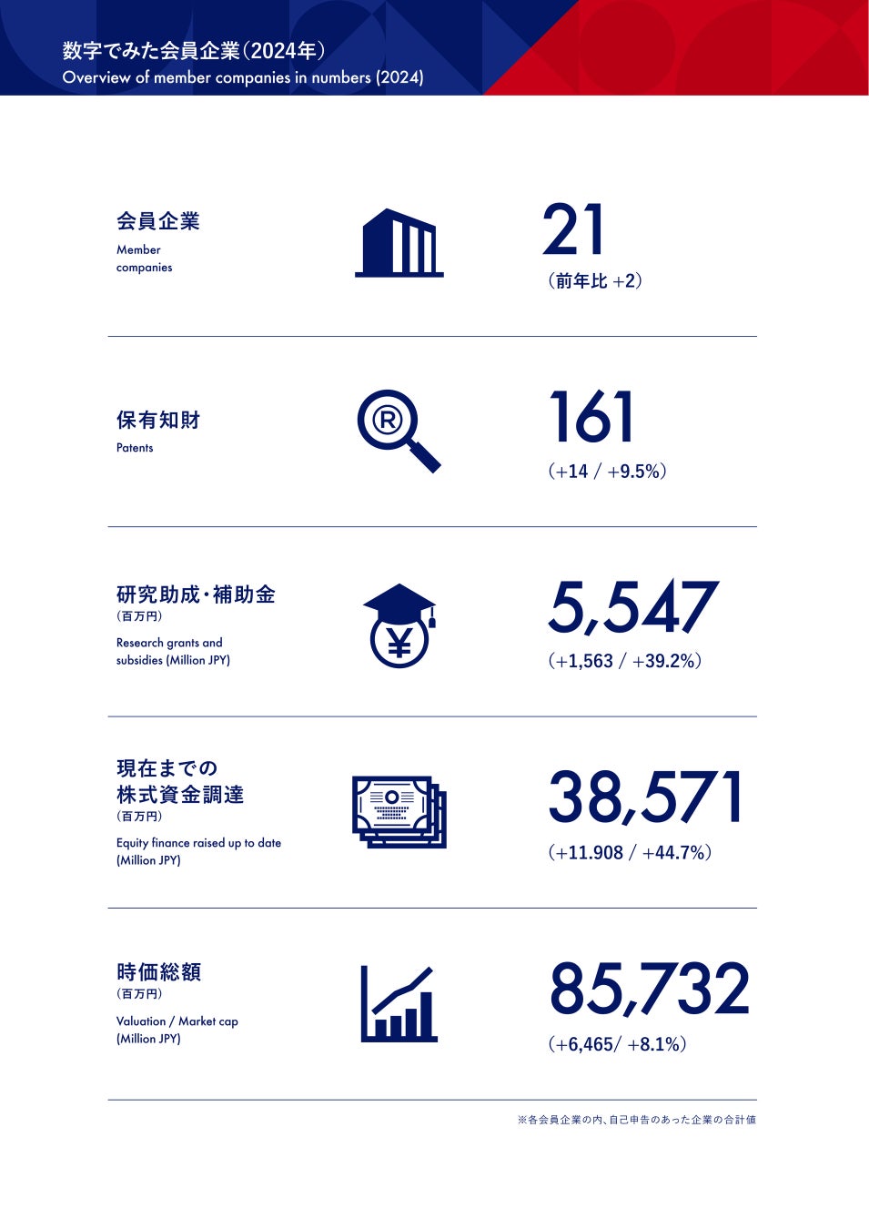 知財数や資金調達額など、会員企業の成長をデータで紹介。協議会が生み出した価値を、具体的な数字でお伝えします。
