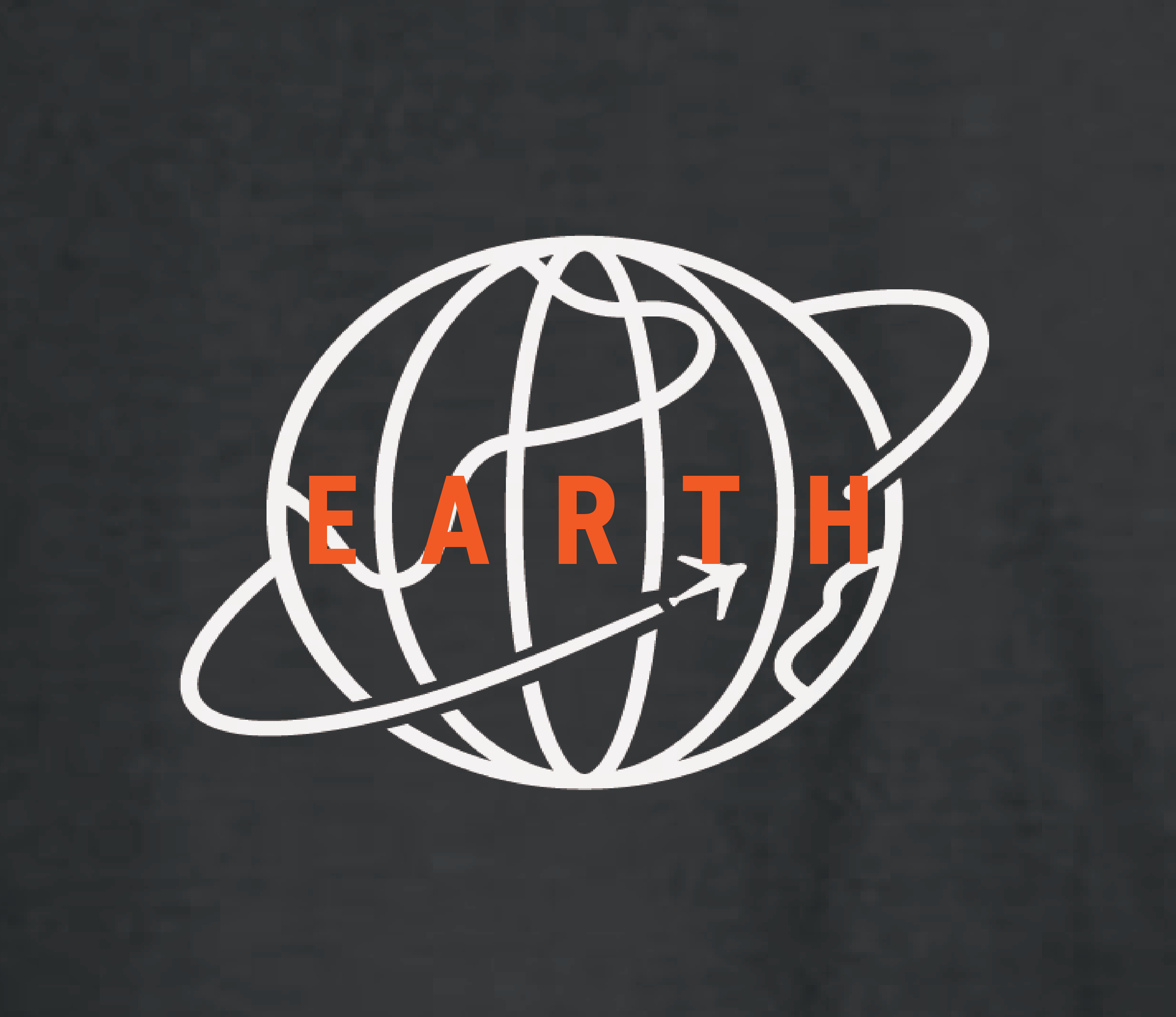 Tシャツにワンポイントで付いている地球儀。注意深く見ると地球は経線で五分割されています。さらに飛び回る飛行機は矢印のようなデザインをしています。