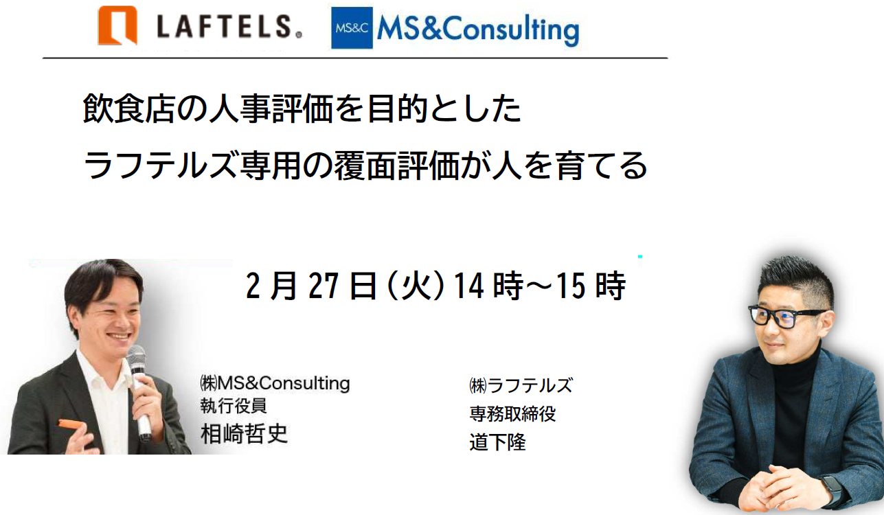 飲食の成長企業を中心に150社以上、2,000店舗以上の人事制度づくりを支援してきたラフテルズ(本社:東京都千代田区、代表取締役社長:井上高司、以下ラフテルズ)は、国内最大の覆面調査モニターサイト「ミステリーショッピングリサーチ」を運営する株式会社MS&Consulting(本社:東京都中央区、代表取締役社長:辻 秀敏、東証証券コード:6555、以下MS&C)と業務提携し、飲食企業の評価制度へ貢献する新たな取り組みをリリースいたします。