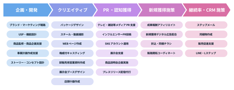 市場調査、商品企画、展示会企画・設営、PR・販売促進までの支援実績があります。