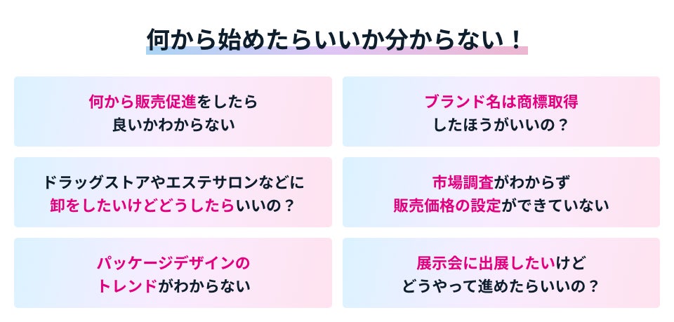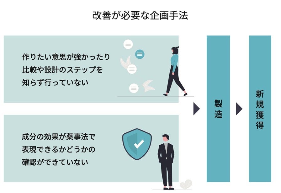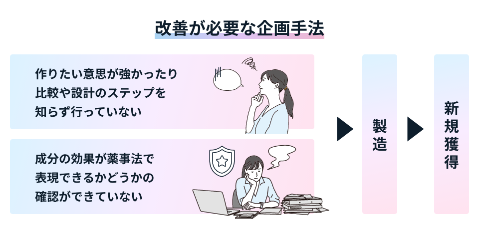 弊社には、化粧品やサプリメント等の開発から販売までの取り組みで、悩みや課題を抱えている企業様からお問い合わせが届きます。 いただく課題の中は、既に商品が出来上がってしまっていて、「専門家に監修者として権威付をしたい」「商品のPR戦略を企画してほしい」などの依頼も多いですが、ターゲットにニーズや金額があっておらず、 課題解決(売れるようになる)までに時間がかかる...という事に遭遇することがあります。そこで、