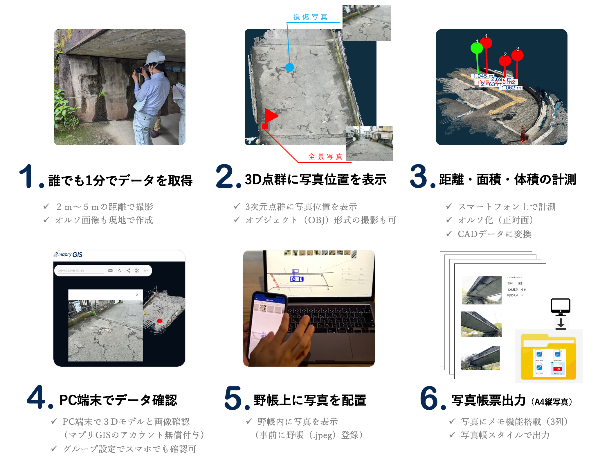 mapry橋梁は、自治体職員が自らデジタル技術(3Dモデル)を活用した点検を実施することが可能な、簡便な橋梁点検支援ツールです。橋梁の過年度調書の損傷図や野帳をインポートし、現場で撮影したデータ(画像、動画、3Dモデル)を、それに紐づけて管理することが可能となっています。現場ではiPhoneを対象部材にかざして点群データを取得し、再現された3Dモデルに写真位置を表示します。