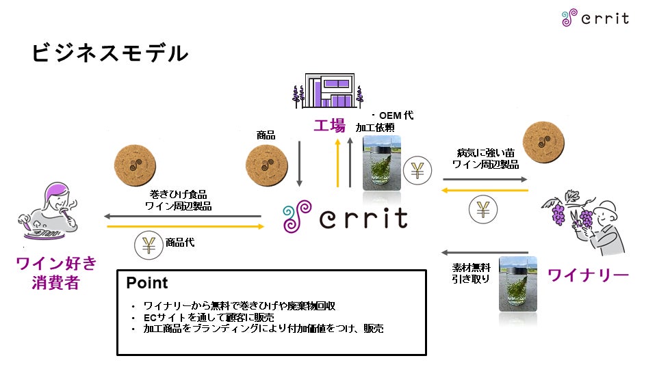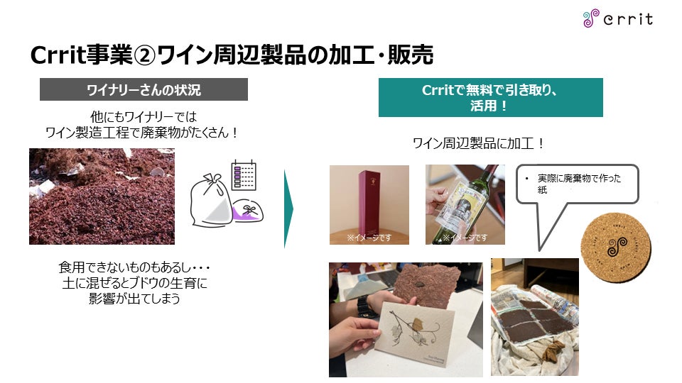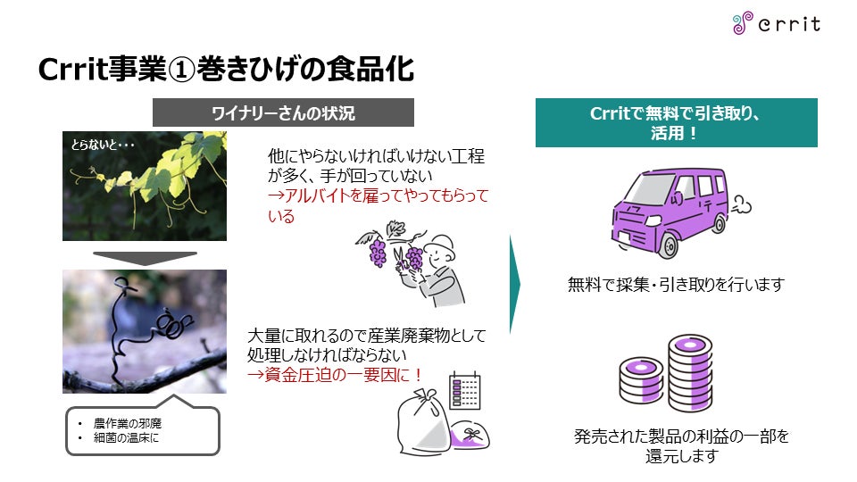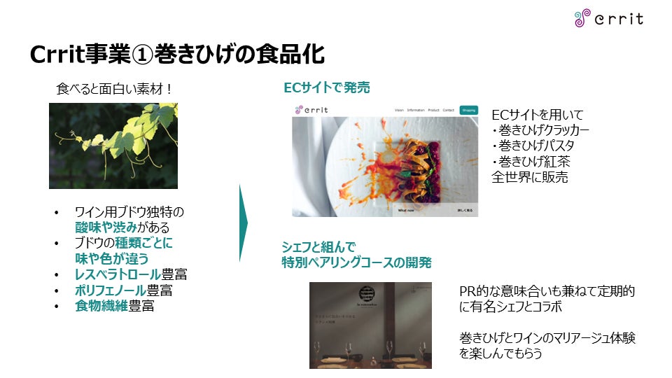 Crrit株式会社では巻きひげをはじめとした、ワインにまつわる未利用素材の利活用を行う会社です。