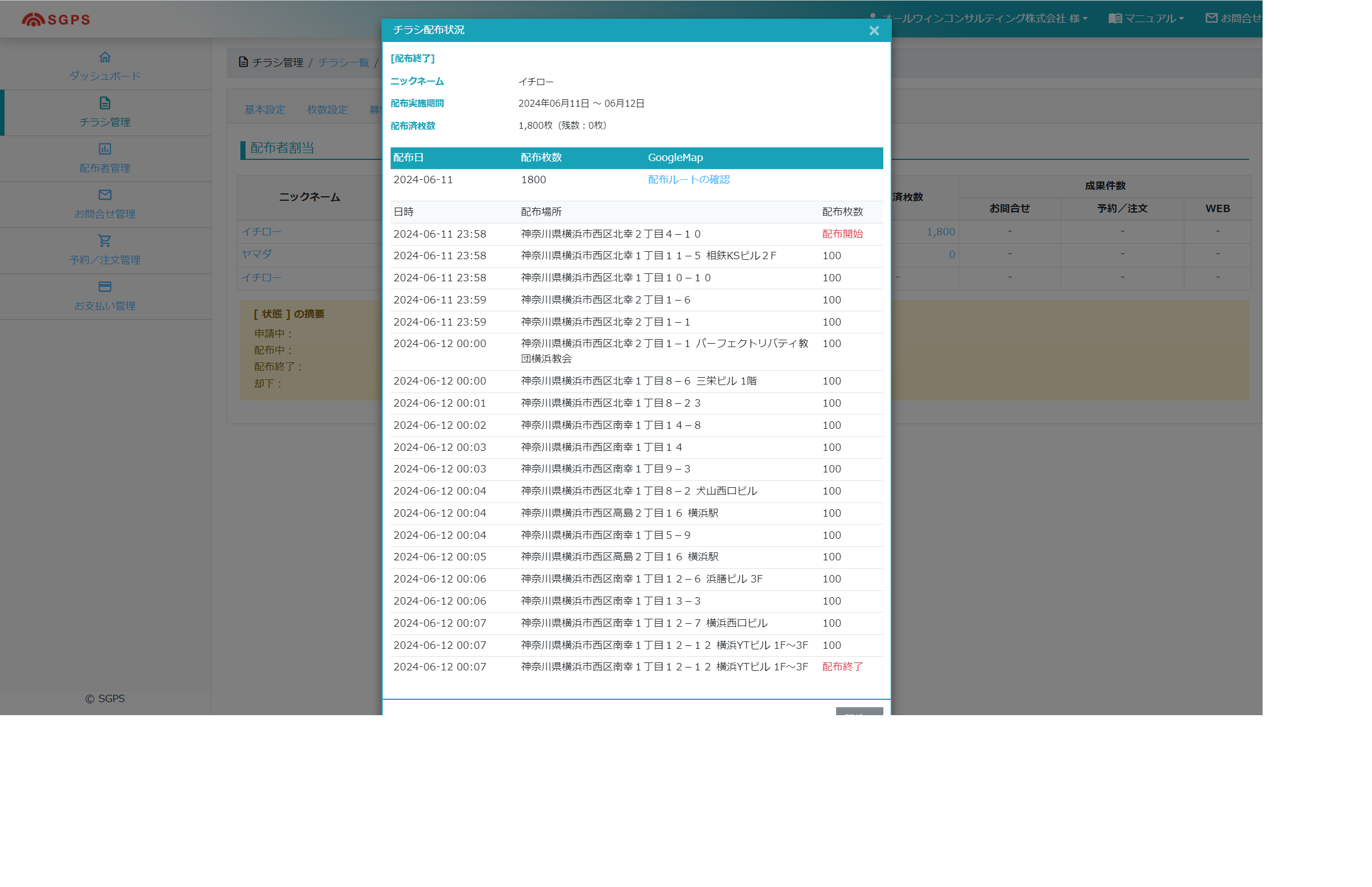 スマートフォンで配布枚数を登録するたびにGPS情報が記録され、お客様への「ポスティング実施報告書」が自動作成される機能を追加しました。お客様は「ポスティング実施報告書」をタイムリーに見ることも出来ます。