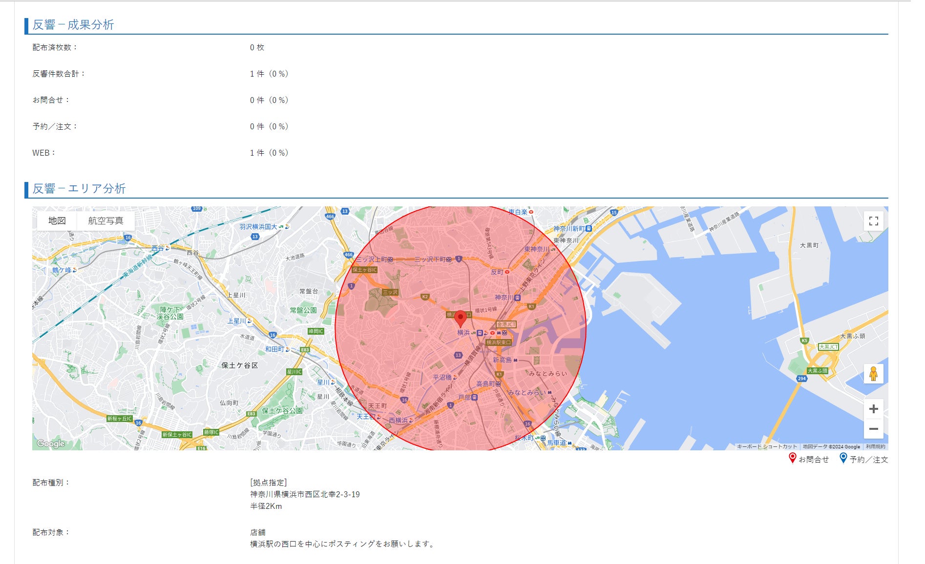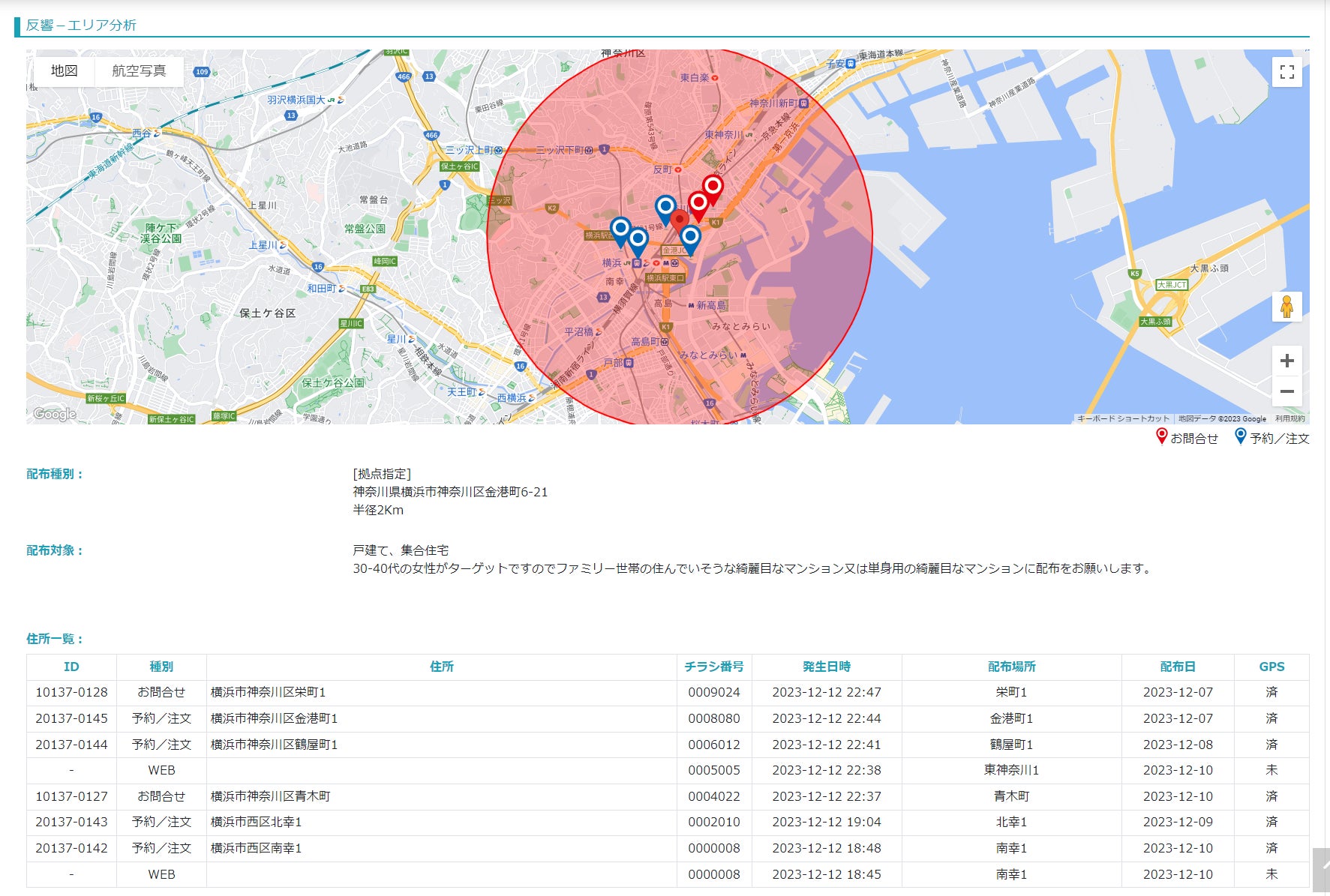 チラシカルテ機能では、チラシの配布状況や成果の発生したエリアが分かりますので、チラシによってどのような成果があったのかを正確に計測することができ、分析結果を次回以降のポスティングに役立てることが可能となります。