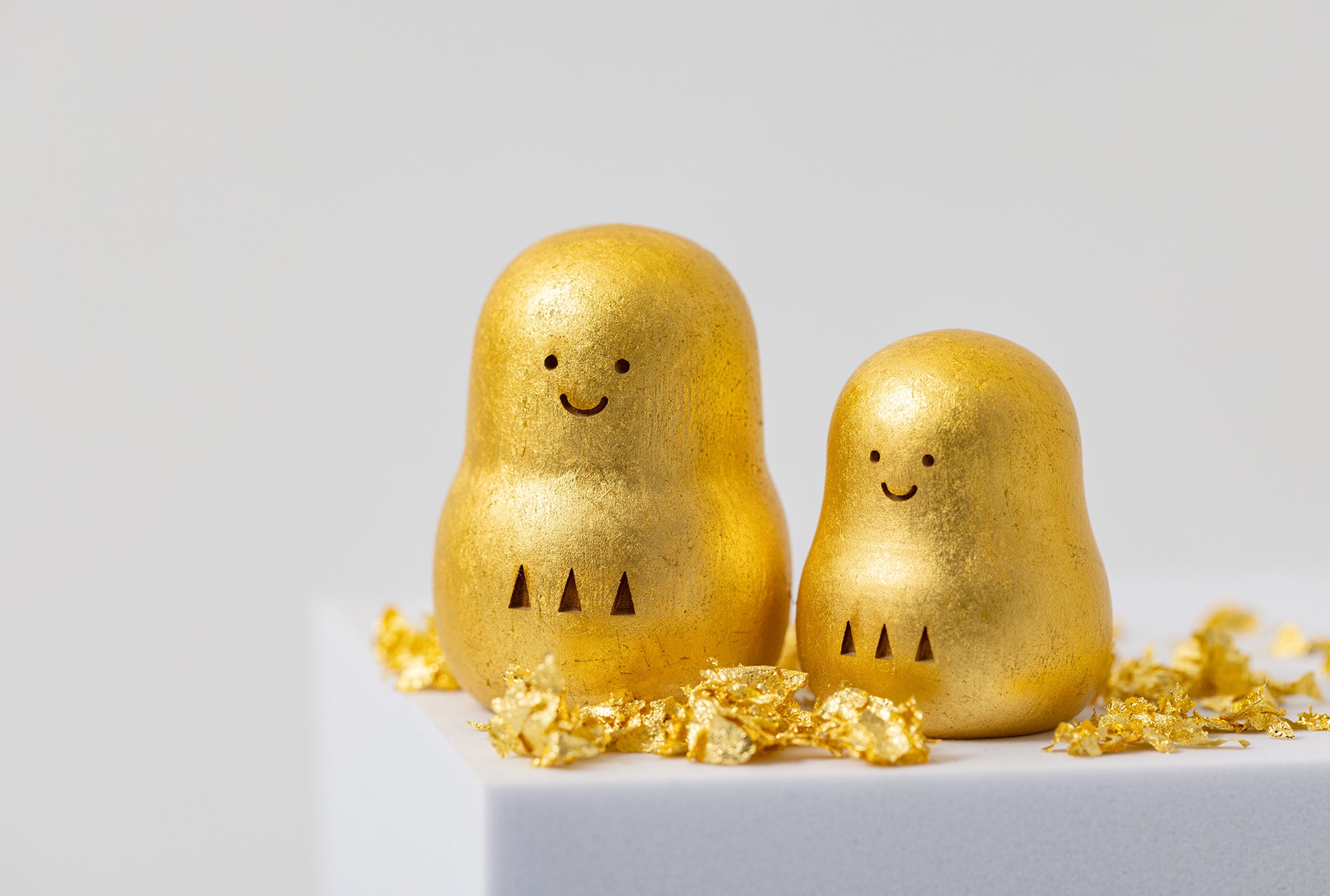 様々な天然木が持つ意味や、古来から色が持つ意味・心理効果などを元に様々な種類が作られてきた「願い小だるま」。「純金」という、もはや説明不要の縁起物、稀少さを纏った願い小だるまは、小さいながら圧倒的な存在感と、金の歴史が積み上げてきたロマンを感じます。