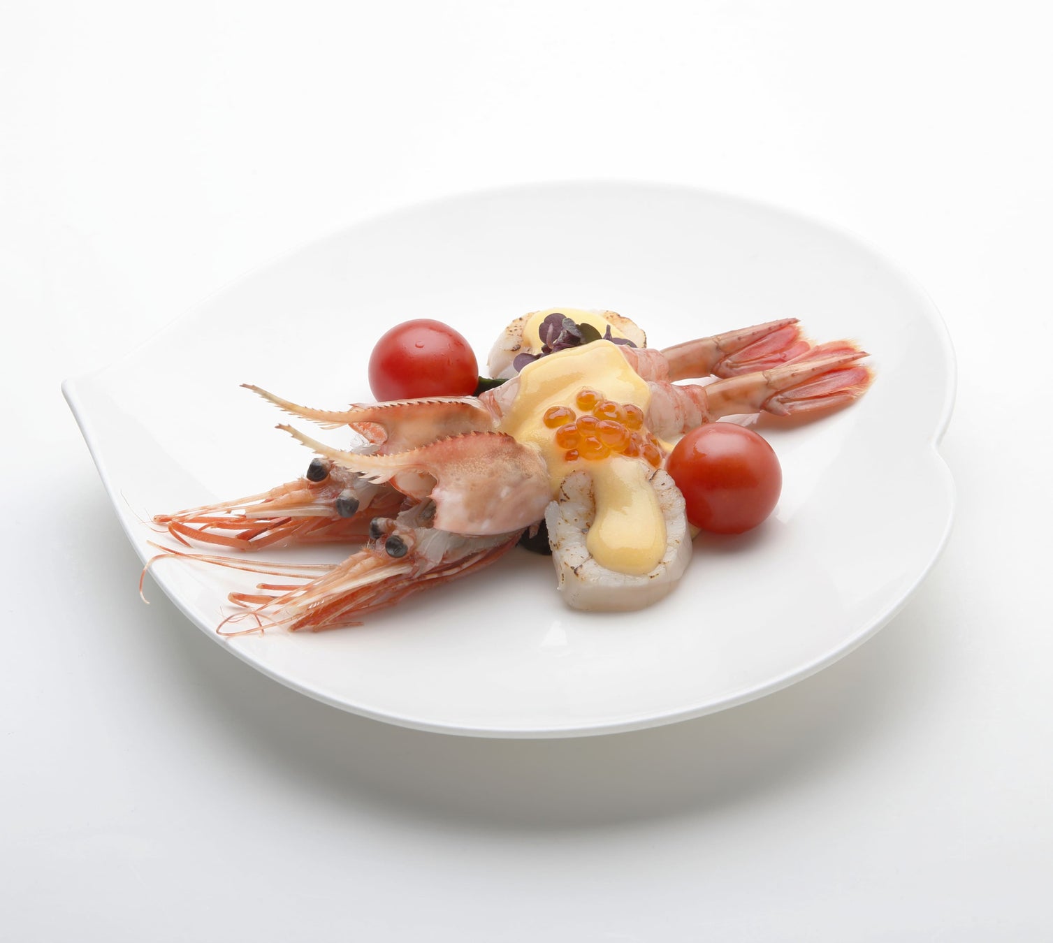 濃厚な味わいのボタンえびを黄味酢でさっぱりとお召し上がりいただける逸品です。炙ったホタテに、イクラものせて、北海道産の魚介をご一緒にお楽しみいただけます。カップルやご友人とシェアしてご満足いただけるよう、すべて2つずつ一皿にご用意して仕上げました。