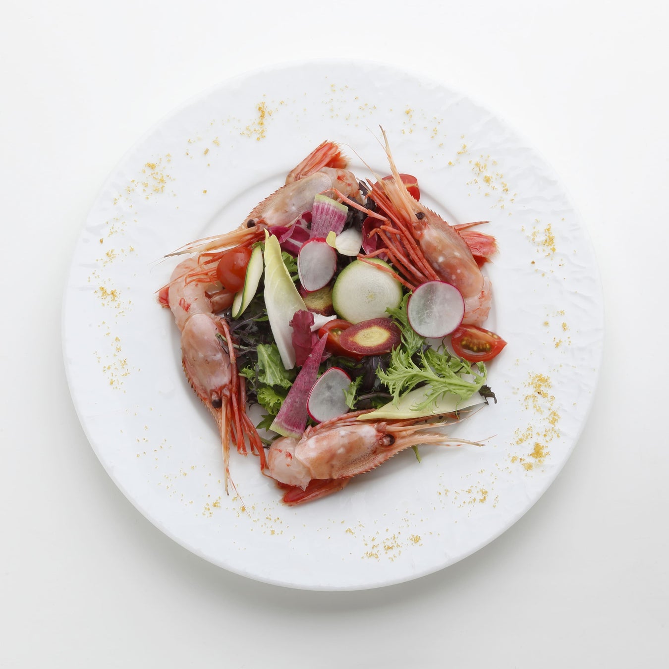 オレンジ風味のドレッシングでマリネしたボタンえび4尾を、ラディッシュ、トレビス、紅芯大根、などとサラダ仕立てにしました。ボタンえびの甘みと柑橘の爽やかな香りに、周りに配したからすみが味わいを引き立てます。