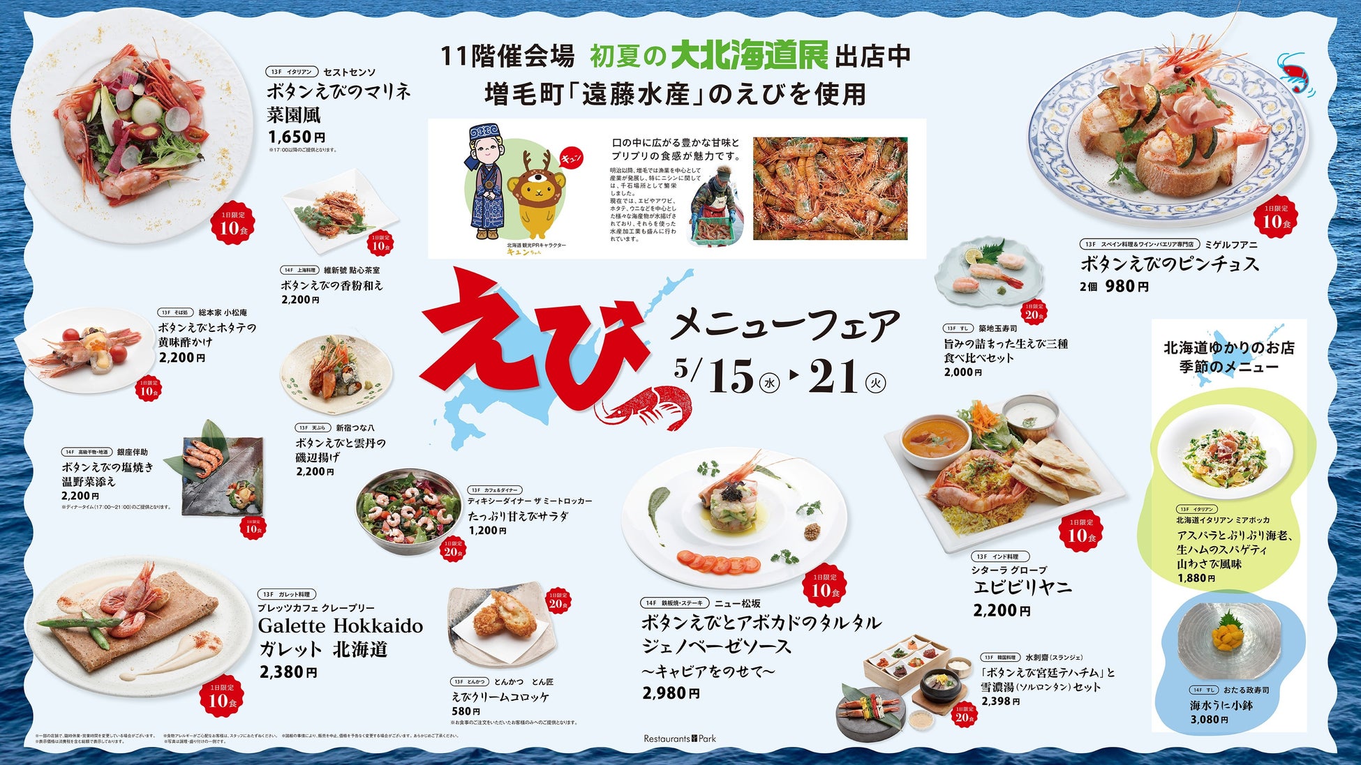 新宿髙島屋タイムズスクエアのレストランズ パーク(12階~14階)では、新宿高島屋「初夏の大北海道展」(11階催会場、5/15(水)~28(火))と連動したメニューフェアで北海道産の「えびメニューフェア」を5/15(水)~21(火)1週間限定で開催いたします。