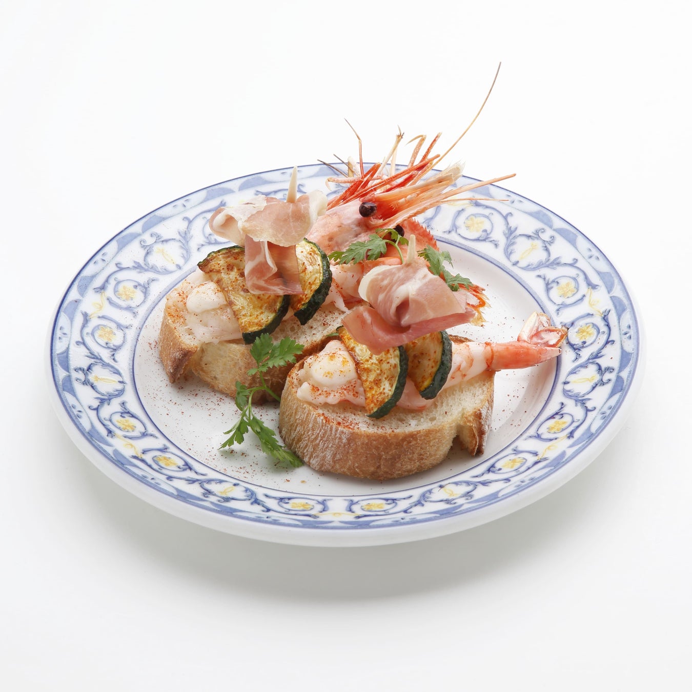 ボタンえびは丸ごと1尾バケットにのせてオーブンで少し火入れし、甘みを引き出したレアな状態にして、ガーリック風味のアイオリソースとズッキーニ、生ハムを組み合わせました。ボタンえびの甘みと潮の風味、さらに生ハムのほどよい塩気を、アイオリソースでまろやかに包んだ濃厚なピンチョスです。
