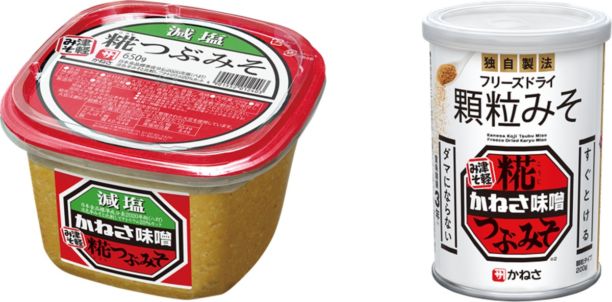 「かねさ 糀つぶみそ」ブランドとして初となるラインアップは、糀割合を変えずに塩分を減らした「かねさ 糀つぶみそ 減塩」と生みそ本来の風味を味わえる独自製法の「かねさ 糀つぶみそ フリーズドライ顆粒」の2品です。東北地方を代表するみそブランドとして、健康ニーズにお応えする減塩タイプ、簡便ニーズにお応えする顆粒タイプを商品化しました。
