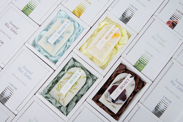 植物由来の天然ワックスに、フランスの調香師が丁寧にブレンドしたフレグランスオイルを入れて作ったワックスタブレットです。クローゼット·シューズボックス·引き出し·浴室の中にかけておくとほのかな香りが長期間続きます。モールドから原料の配置、彫刻と包装まですべてハンドメイドで丁寧に製作されるので、世界でたった一つのおしゃれなデザインがインテリアオブジェとなり、ギフト用に選ばれています。