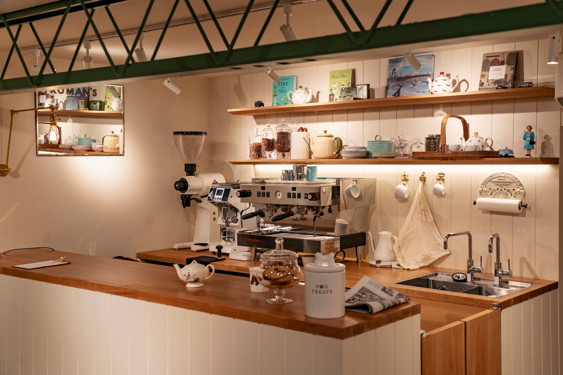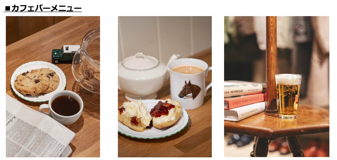 1階はファームキッチンをイメージし、シングルオリジンとブレンドより、生産地や品質を厳選したコーヒー豆を使用したカフェバーが併設されておりブリティッシュを代表する紅茶も豊富に取り揃え、クリームティーも提供する。1階のカフェバーで提供されるビールのセレクターには、クラフトビールマガジン「TRANSPORTER」発行人であり、数々のクラフトブルワリーのディレクションを請け負う田嶋 伸浩が参画した。