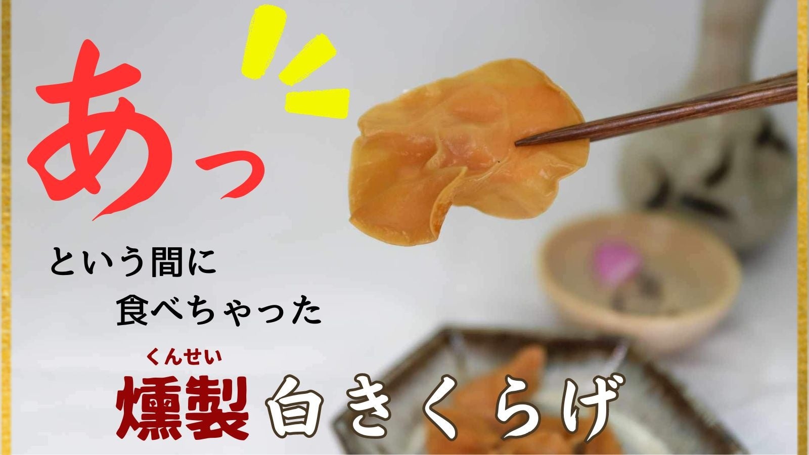 醤油に漬け込み燻製にしていますので、真っ白ではありませんが、キクラゲの大きな特徴であるコリコリ食感も出来るだけ残るように仕上げていますので、まるで生のキクラゲを食べているようです。