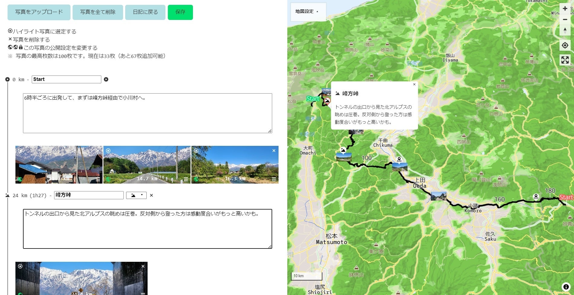現状では、活動日記を作成する方法は、モバイルアプリの位置情報による収録、ファイルアップロード(*.gpxと*.fit対応)、そしてGarmin Connectとの同期の3つに限定されてるので、これからは対応のサイクルコンピューターブランドを増やし、利便性を高めていく必要があります。