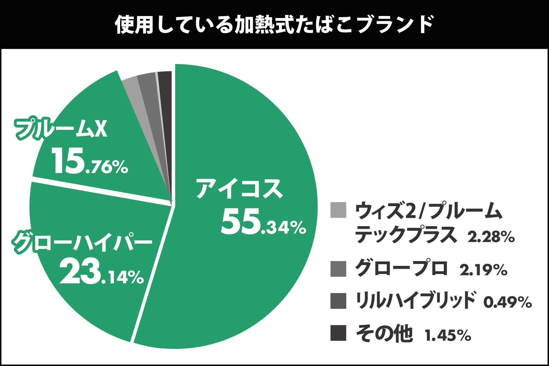 結果、加熱式たばこメーカー各社のシェア率は、1位がアイコスで55.34%、2位がグローハイパーの23.14%、3位はプルームXの15.76%となりました。
