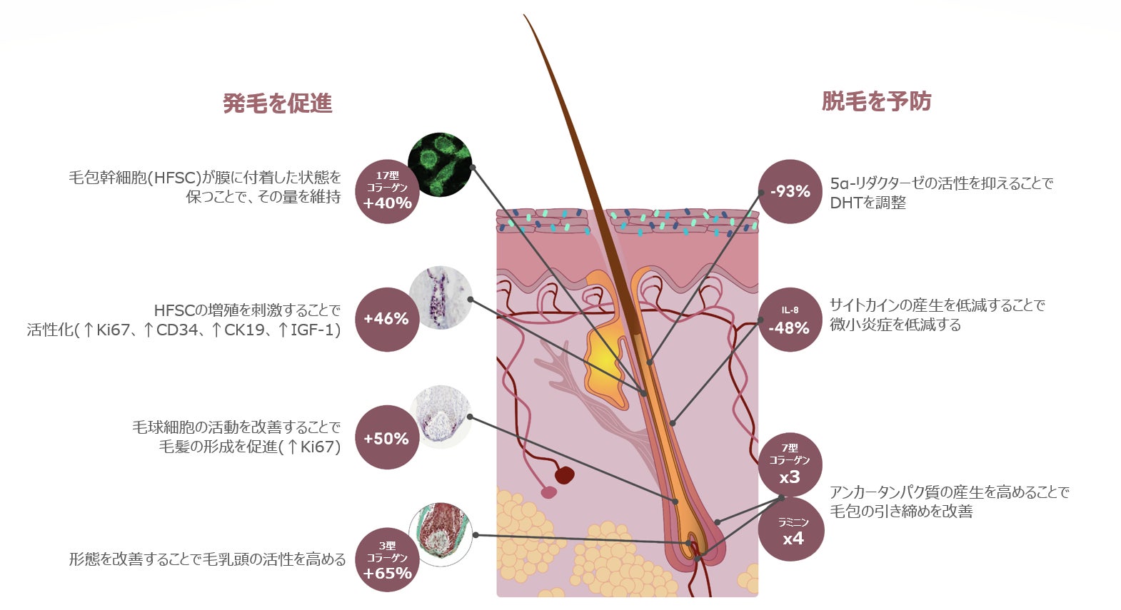Capixyl®は、毛髪を形成する元となる毛包幹細胞をダメージから保護し、発毛を促します。同時に、毛髪を包み込む毛包を引き締めることによって、毛髪を抜けにくくする効果を付与しています。今後は、新たに加わった効果データを元に、シャンプーなどの洗い流し製剤にも配合して頂けるように、国内向けのプロモーションを行ってまいります。また、このメカニズムは毛周期の短いまつ毛を長く育てることへのアプローチにおいても最適で、Capixyl®は国内外で数多くのまつ毛美容液製品に安全に配合され体感して頂いております。今後は目に優しく、エイジングケア効果もある眼周り専用のアイシャンプーや、1日で落としてしまうマスカラなどのメイクアップ品にも提案をして参ります。