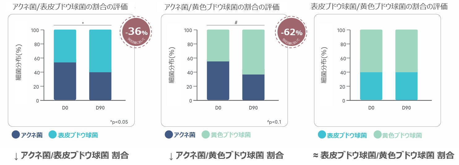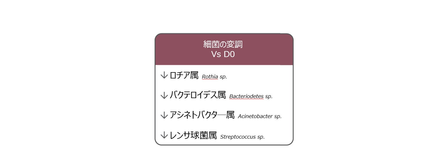 更に、18~65歳の抜け毛に悩む健康な男女被験者21名に対して、上記と同様の試験を行い、頭皮の細菌叢を分析したところ、脱毛傾向で特異的に割合が増えると考えられるロチア属(Rothia sp)※2などの常在菌の割合が減少し(結果グラフ③)、脱毛の原因の一つとして考えられるアクネ菌の割合も減少したことが確認されました。(結果グラフ④)