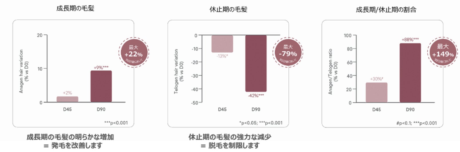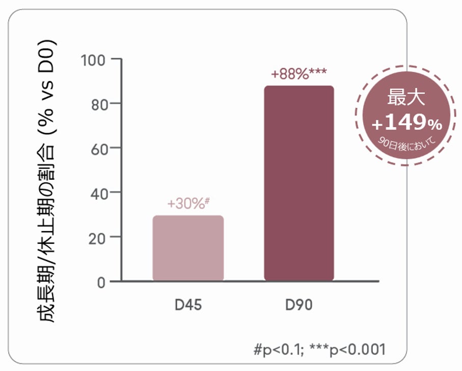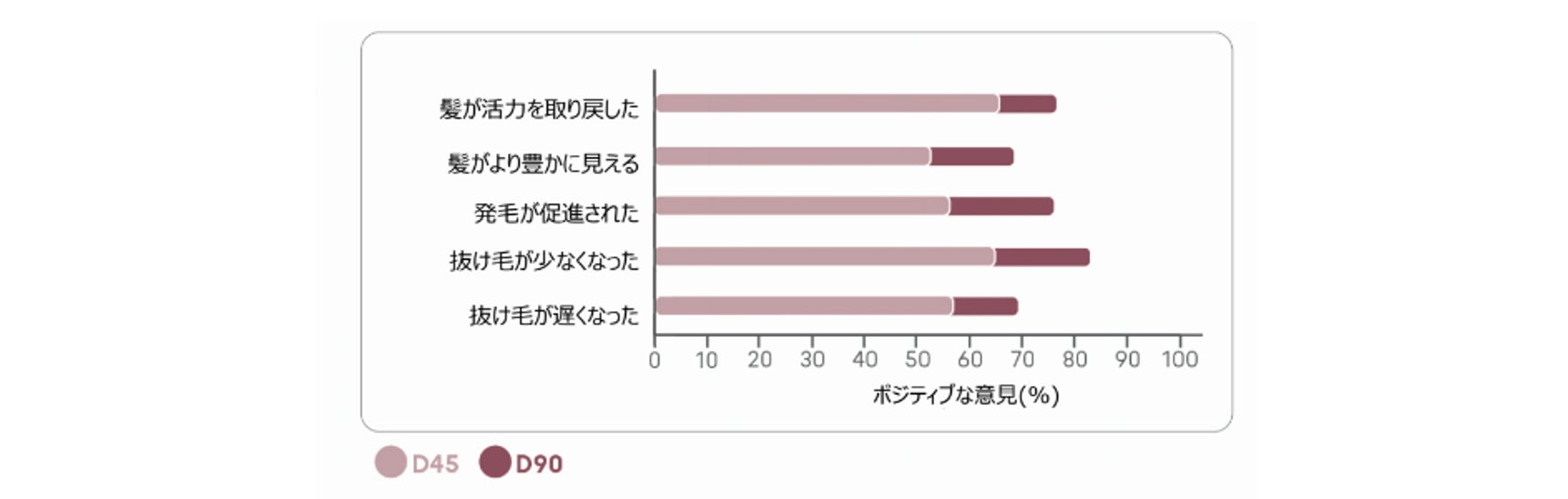 Capixyl®を使用することで、成長期の毛髪が増加し、休止期の毛髪が減少することで、脱毛傾向が改善されました。(結果グラフ①)また主観的なアンケート結果においても、「髪が活力を取り戻した」「髪がより豊かに見える」などのすべての評価項目で、半数以上の被験者から肯定的な回答が得られました。(結果グラフ②)