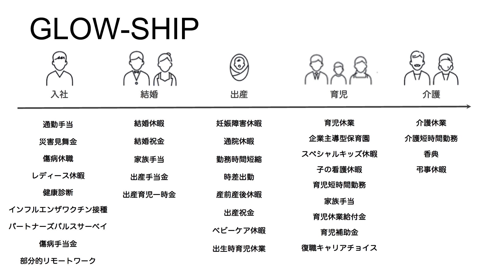 「GLOW(輝き)」「GROWTH(成長)」「SHIP(状態・らしさ)」を組み合わせています。ライフステージに対応しながら、社員が輝き続けられる環境を提供する制度を指します。