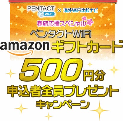 対象期間中に海外WiFiレンタル比較ナビ経由でペンタクトWiFiサービスへレンタル申込みされた全ての方にAmazonギフトカード500円分をプレゼント致します。