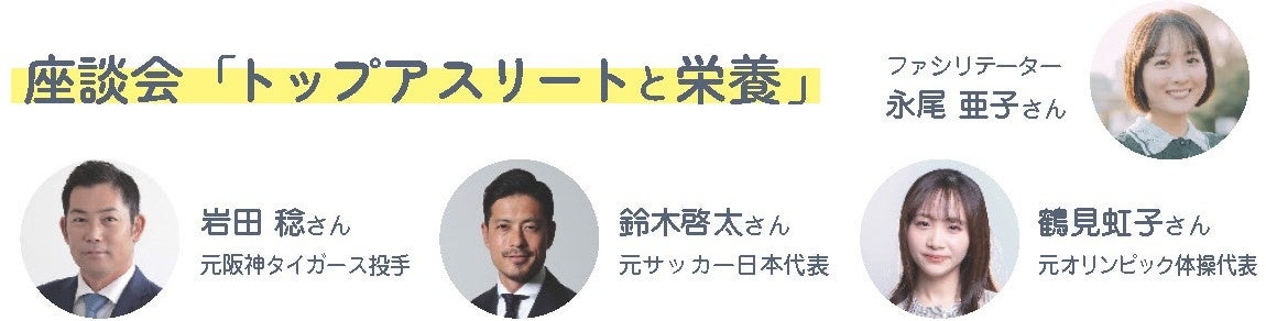 第2部には、横浜市立大学附属病院集中治療部の高丘朋果さん(管理栄養士)による「病気と栄養」、鈴木啓太さん(AuB株式会社代表取締役・元サッカー日本代表)による「腸内細菌について」のレクチャーを、そして第3部は「トップアスリートと栄養」をテーマに、岩田稔さん(元阪神タイガース投手)、鈴木啓太さん(元サッカー日本代表)、鶴見虹子(元オリンピック体操代表)さんを登壇者として迎え、プロ時代に行っていた栄養管理やケガや病気の際の栄養管理法など、各分野のトップアスリートに座談会を行います。