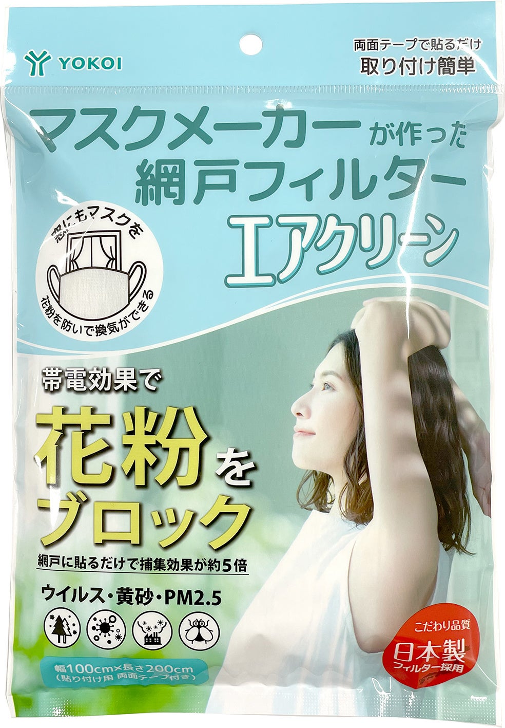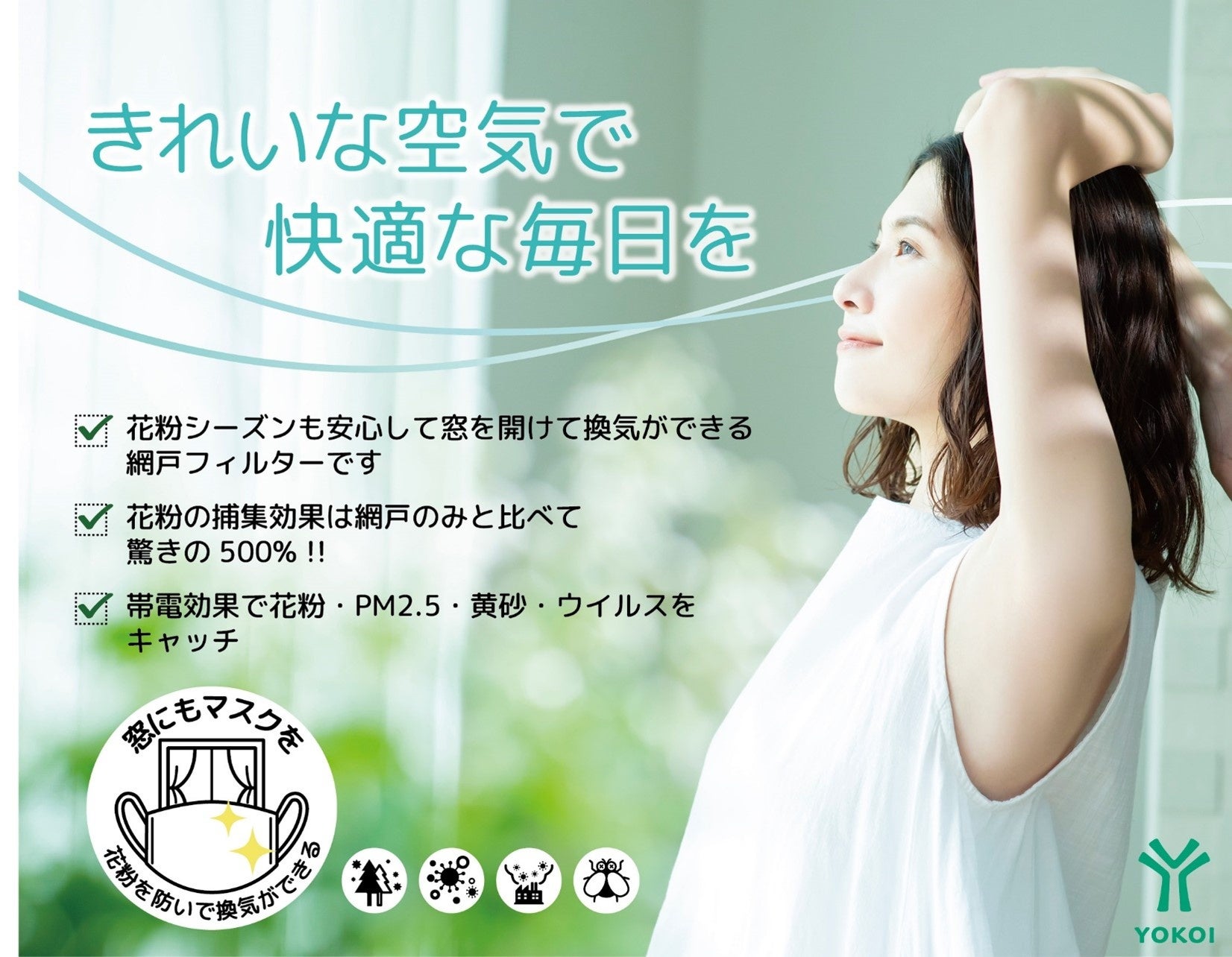 株式会社ヨコイは創業60年の老舗マスクメーカー。愛知県名古屋市内の自社工場にて日本製マスクを製造しております。【網戸フィルター エアクリーン】は、『窓にもマスクを』という発想で、マスクで長年培った技術を駆使した高性能フィルターですので、花粉を気にせず室内空間をより快適に過ごしていただけます。