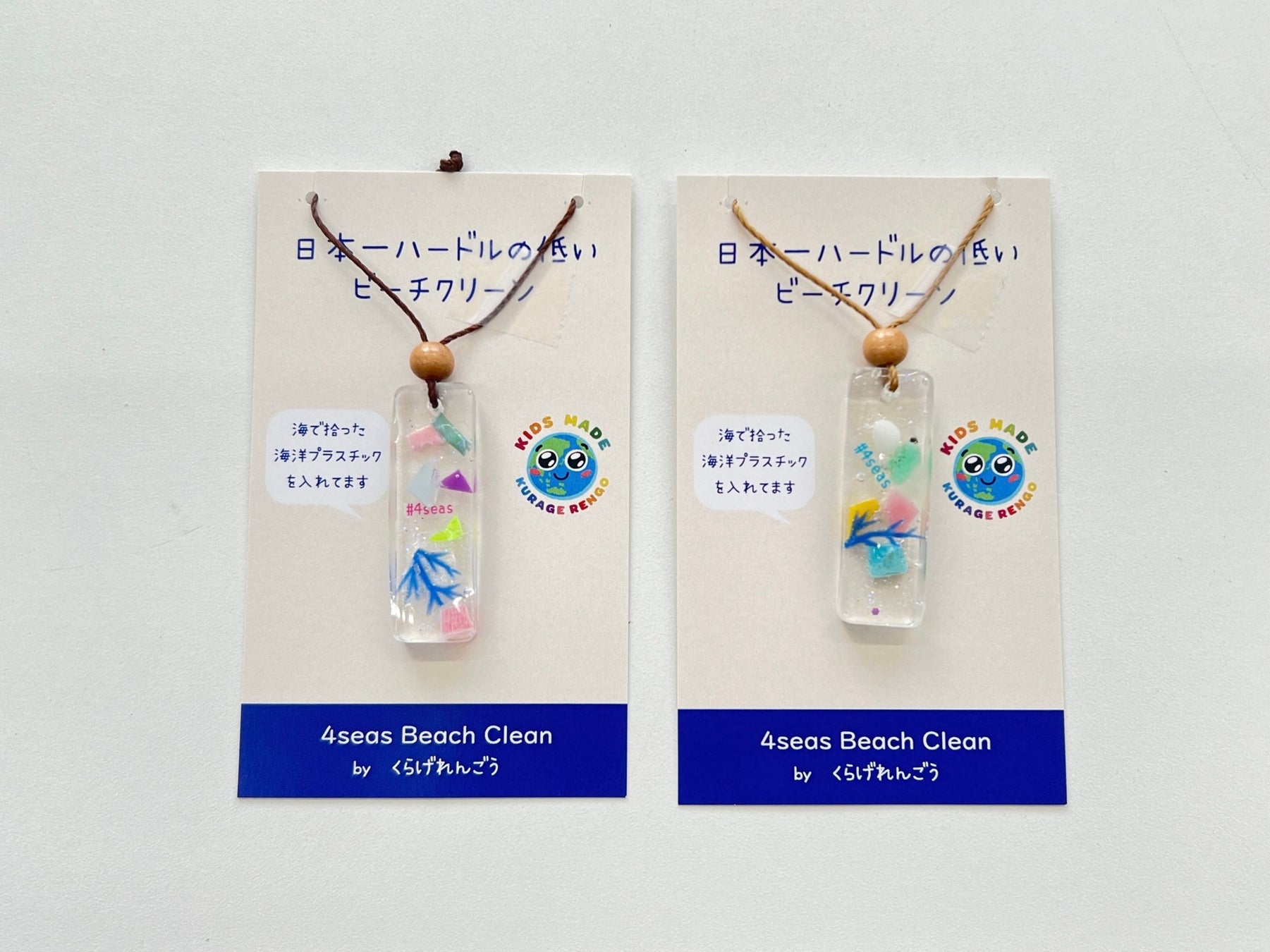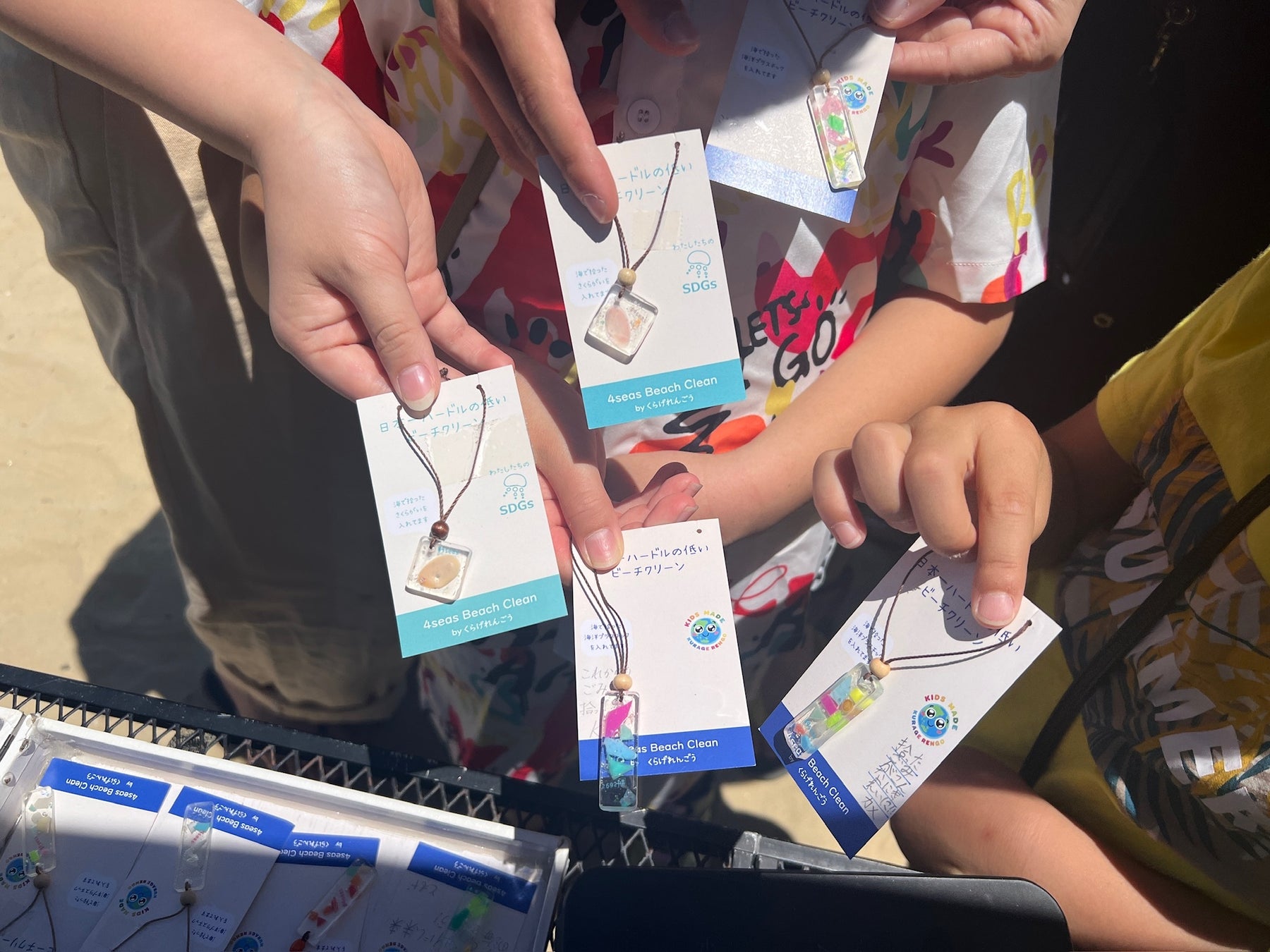 子供たちが思い思いに作ったキーホルダーは、ごみで作られたとは思えないカラフルでかわいいキーホルダーは、海に訪れた人たちに清掃活動の声がけをするときに使用し、見せるとみんながごみ拾いをしてくれる、同社の環境啓発活動には欠かせない環境啓発アイテムです。