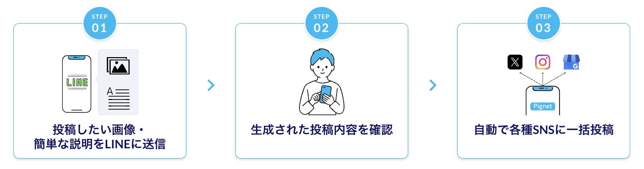 このツールは、オンラインに不慣れで時間が足りない飲食店の方でも、簡単にオンライン集客ができるよう設計されています。LINEだけの操作で、インスタグラム、X(旧Twitter)、Googleビジネスプロフィールに合わせた投稿内容をAIが自動生成し、その内容を一括投稿します。