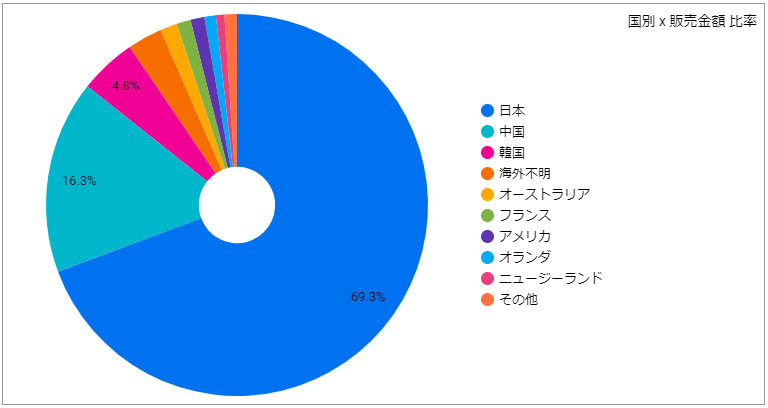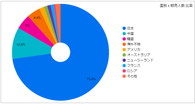 国別の販売比率を人数での比率および販売金額での比率で集計しています。