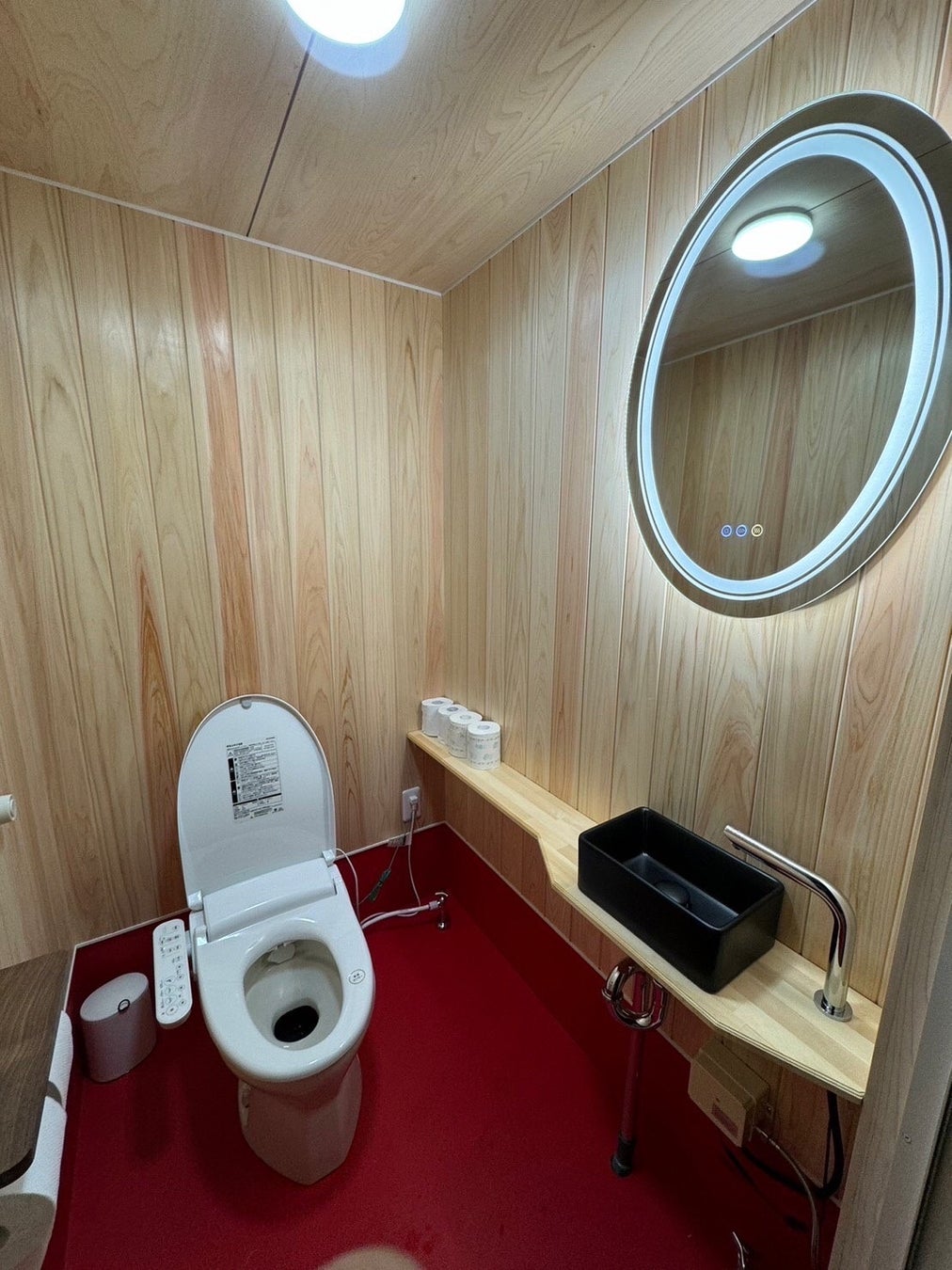 また、災害時には枯渇する石鹸などの洗剤の節約や、洗剤を洗い流す必要もないため節水効果にも繋がります。さらに内装にはヒノキを使用したことで、脱衣所にヒノキの香りが広がり、リラックス効果も期待できるので、避難所で生活をしている被災者の方々に少しでも心を癒してもらえればと考えています。