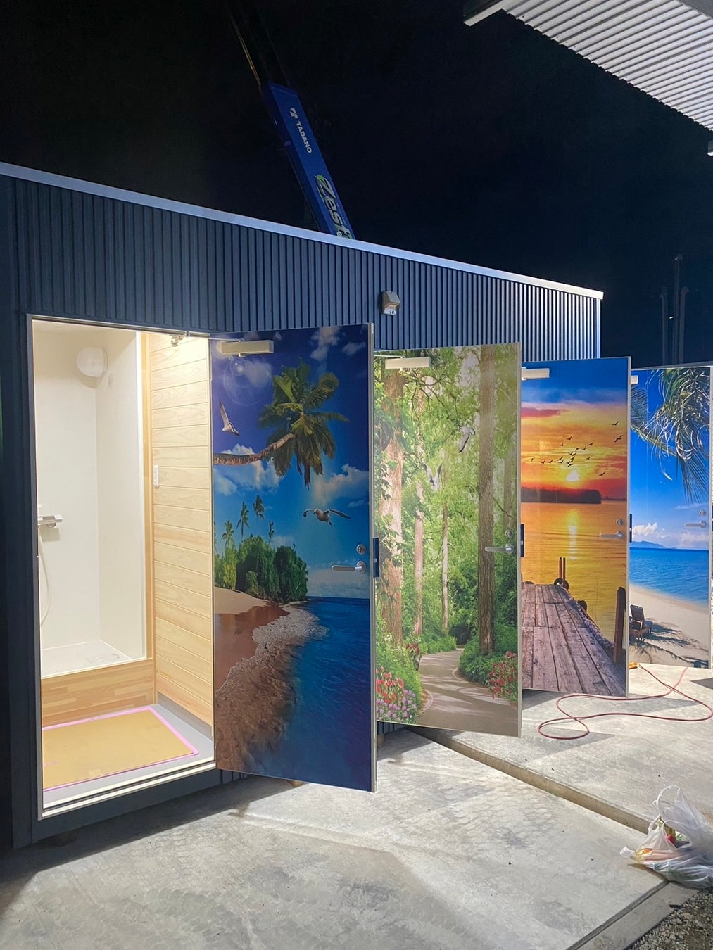 廣瀬名誉教授と連携し、早速開発に取り掛かったものの、シャワー室のユニットが手に入らない、また、開発資金などの課題もあり、構想はあるものの予定通りに開発が進まない現状がありました。そうした状況の中、当社の被災地支援の話を聞き、七尾を舞台にした小説や地元紙にて連載小説を執筆されている小説家の安部龍太郎さんや、当社の取り組みに賛同する企業から開発資金をご協力いただく他、当社の取引先でもある、岐阜県の工務店にも原価で制作にご協力いただくなど、多くの方のご支援・ご協力があり、ようやく”水素水シャワーブース”が完成しました。