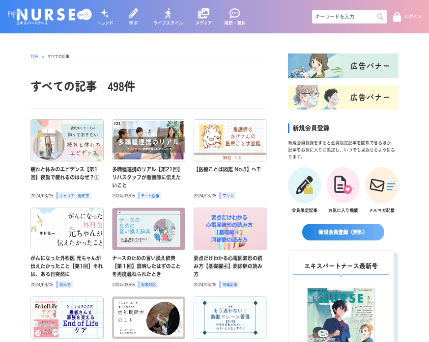 その「エキスパートナース」から、看護情報サイト「エキスパートナースweb」が誕生。ナースの仕事も、生活も、キャリアも、すべてを支えるさまざまな記事を用意しています。