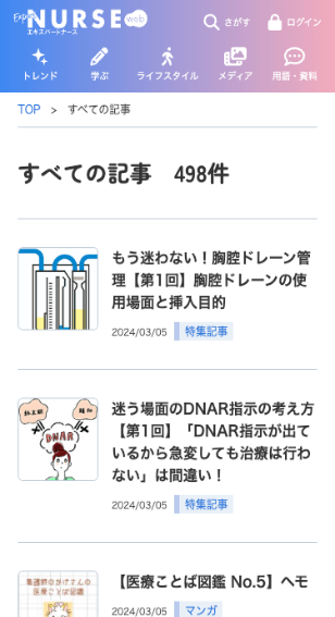 各分野のエキスパートが執筆した特集・連載や、看護に関わる最新ニュース、ライフスタイル、働き方、学会・イベント情報、求人情報など、さまざまなジャンルの情報を提供します。用語・資料も充実させ、知りたい言葉を手軽に検索できるので、調べものにも役立ちます。
