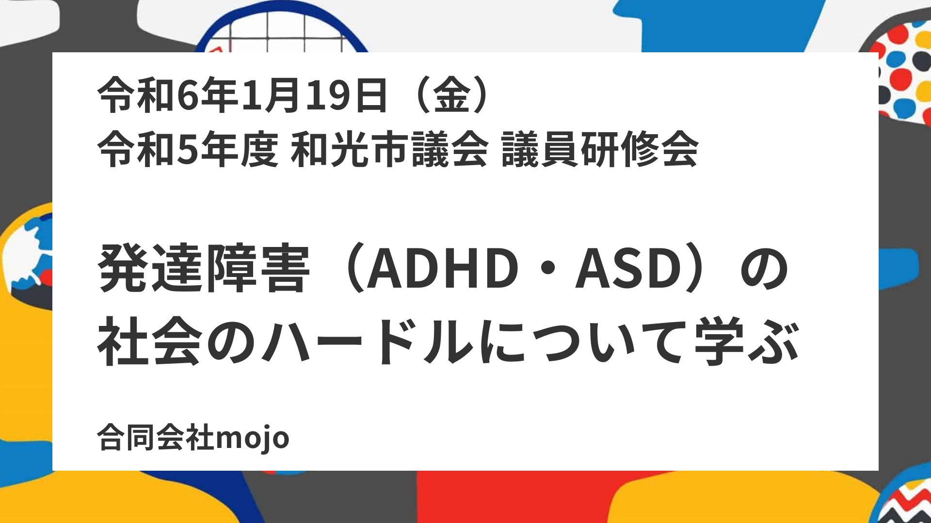 発達障害の理解を社会に広げる活動をしている合同会社mojo(本社:東京都板橋区、代表:渡辺すみれ子 岩切健一郎)は、2024年1月19日に和光市義会の議員の皆様に「発達障害の社会のハードルを学ぶ研修会」を開催しました。