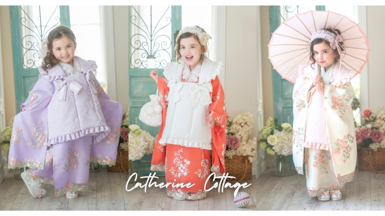 着物をワンピースにアレンジしたことでご自宅でのお支度が可能になった、キャサリンコテージオリジナルの3歳女の子七五三着物セット。着付けの知識もコツさえもいらず、とびきりかわいい和装スタイルを叶えます。