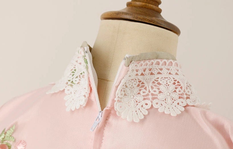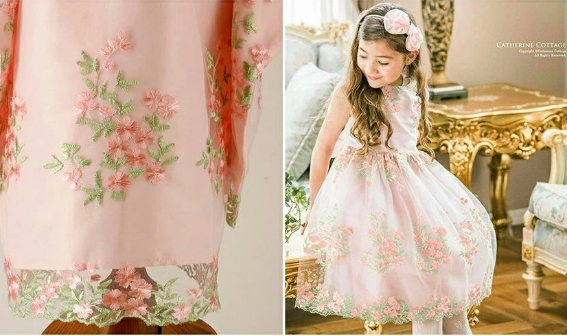 着物ワンピースに使っている花刺繍チュールレースは、子供ドレスショップキャサリンコテージで人気のドレス生地。