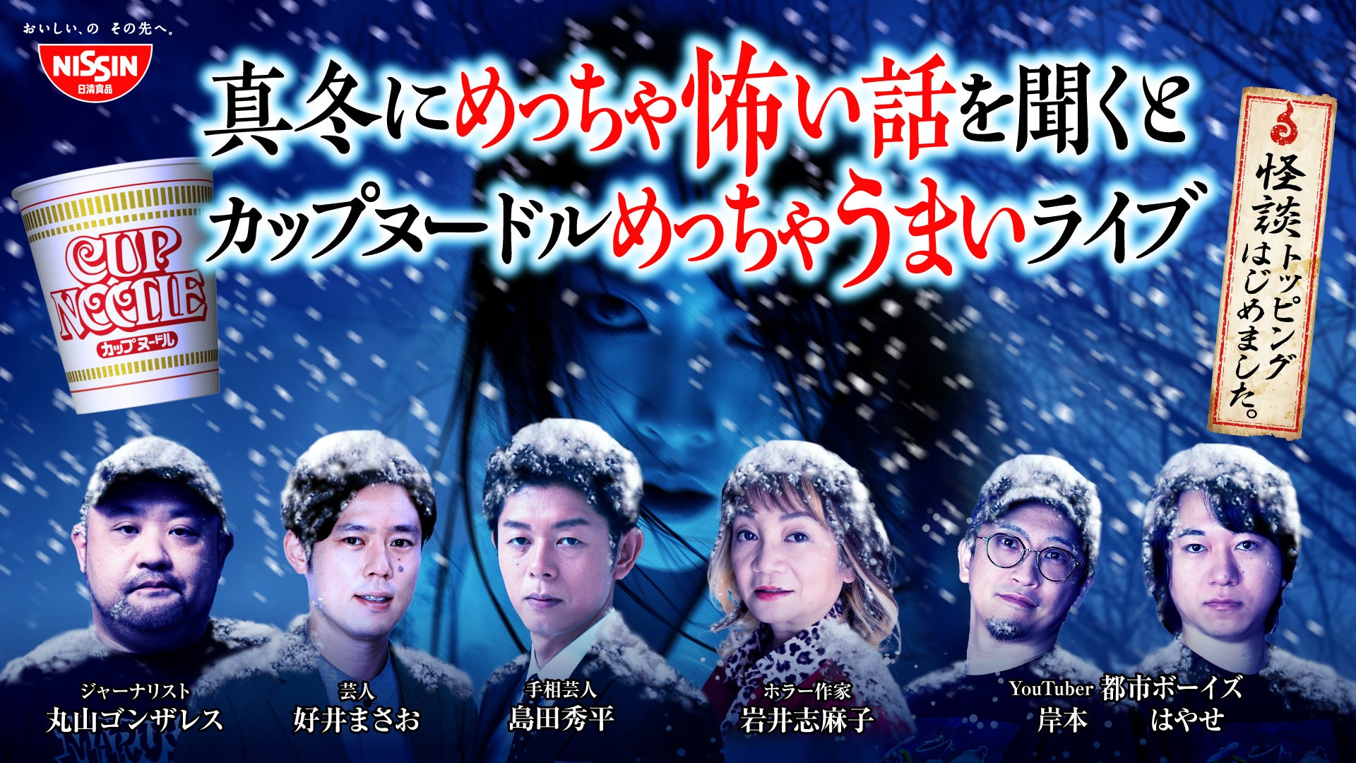 6名の怪談師による珠玉の「怪談トッピング」の中から、お好みの「怪談トッピング」を見つけてください。「寒さ」×「怪談」で本当に「カップヌードル」はうまくなるのか、信じられない方にこそ体感していただきたいイベントです。