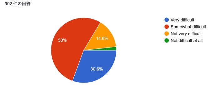 非常に難しいと感じる 276人(30.6%)、やや難しいと感じる 478人(53%)、あまり難しくない 132人(14.6%)、まったく難しくない 16人(1.8%)