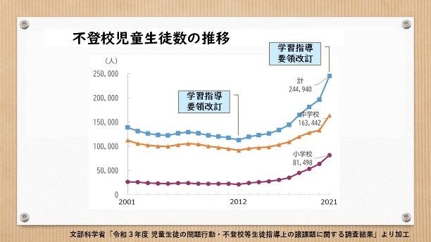 不登校の背景に、学習面でのつまずきがあることも少なくありません。2011・2012年から二度の学習指導要領の改訂を経て、子どもたちが中学卒業までに学ぶ英単語数は900語程度から1200語、そして今2500語を超えようとしています。その間、不登校は急増し、2023年度には2012年度のおよそ3.1倍、約34.6万人に達しています。