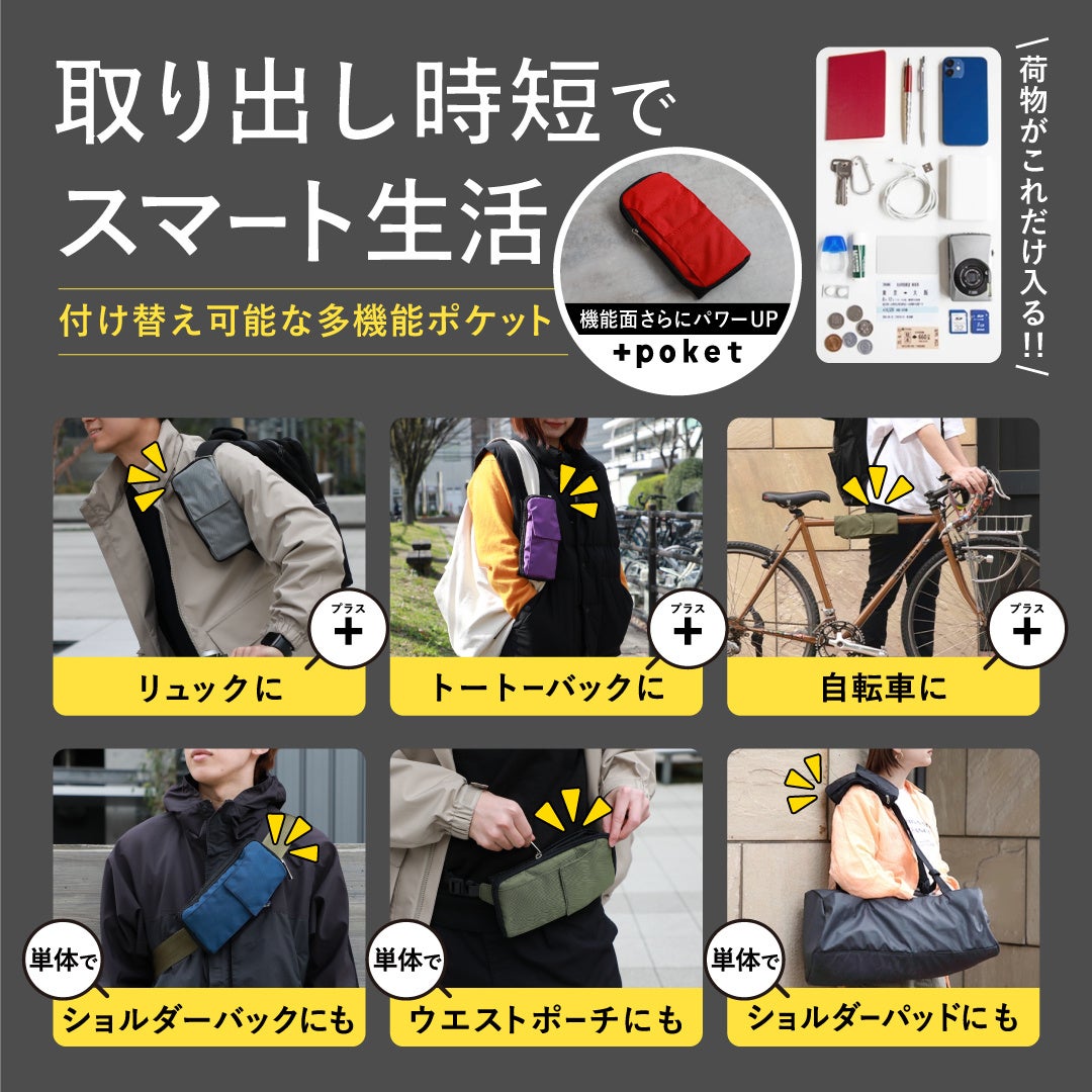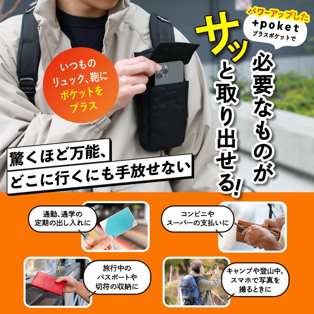 今作は【+poket】自体を更に使いやすくする補助パーツも登場!ポケットの中にジャストフィットするオリジナルの薄型ウォレット。鍵や定期の出し入れを更にノンストレスにするオリジナルキーチェーン。ランニングや自転車の運転中にポーチのずれを軽減する固定用のベルト。この3つのアイテムを使用用途に合わせて使うことにより前作以上に便利なアイテムに!