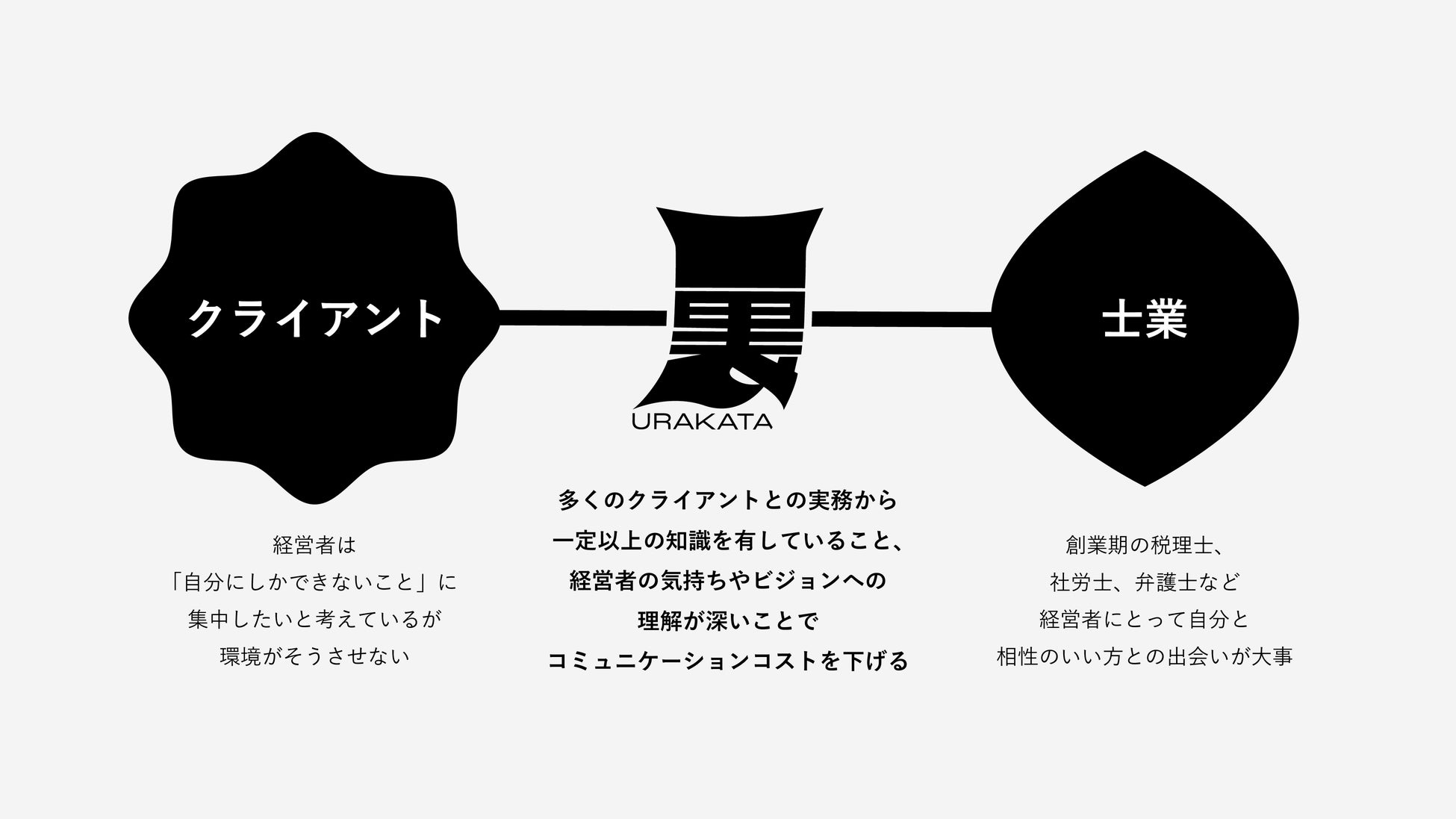 URAKATAは経営者と士業パートナーの間に入り、独占業務は士業パートナーに推進いただきながら、経営者と伴走します。経営者の目線で事業推進に必要な情報を整理し、わかりやすくお伝えします。