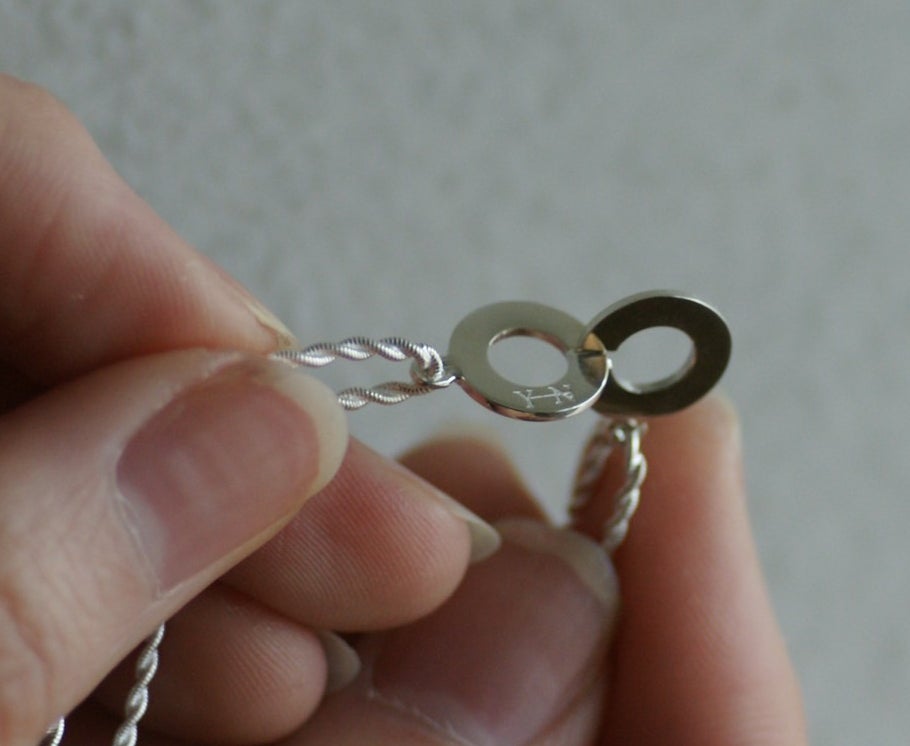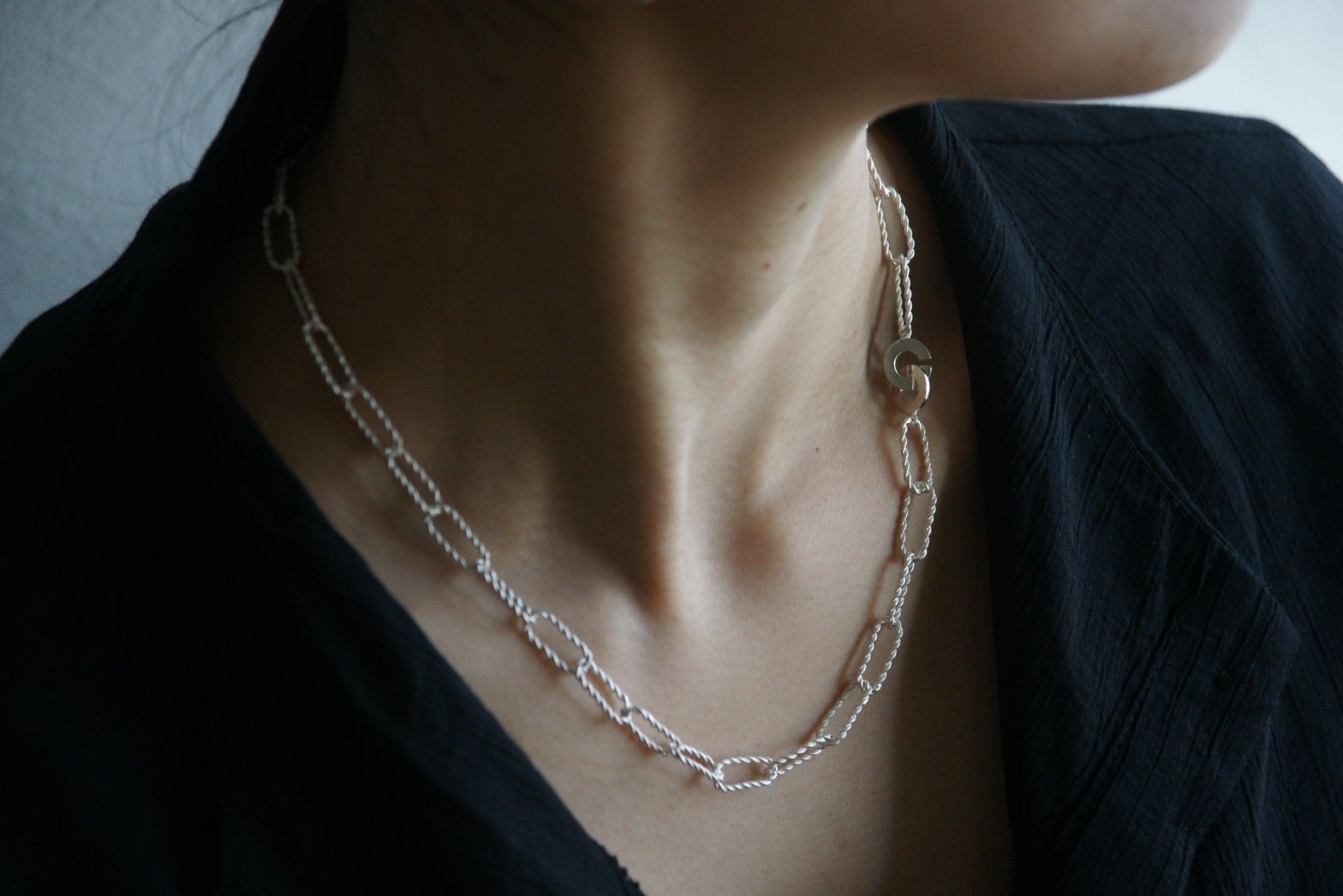 こちらの新作は、サーミブレスレットに使用するピューターワイヤー2本を捻ったものを型取り、鋳造をして楕円状のリングにし、それを繋げたチェーンのブレスレット&ネックレスを作りました。