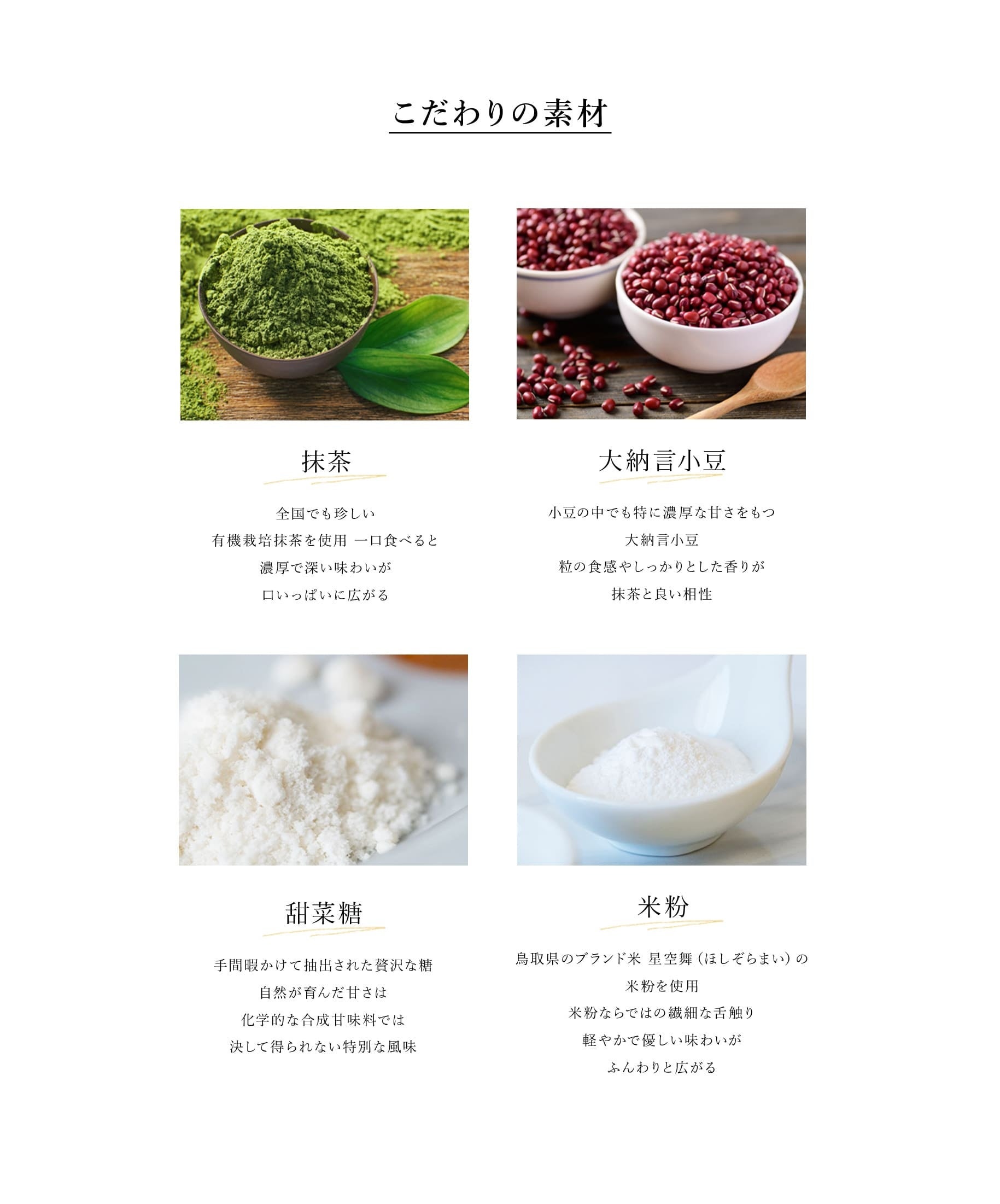 濃厚で深い味わいが特徴の全国でも珍しい有機栽培抹茶としっかりとした香りと甘さを持つ大納言小豆をふんだんに使用しました。