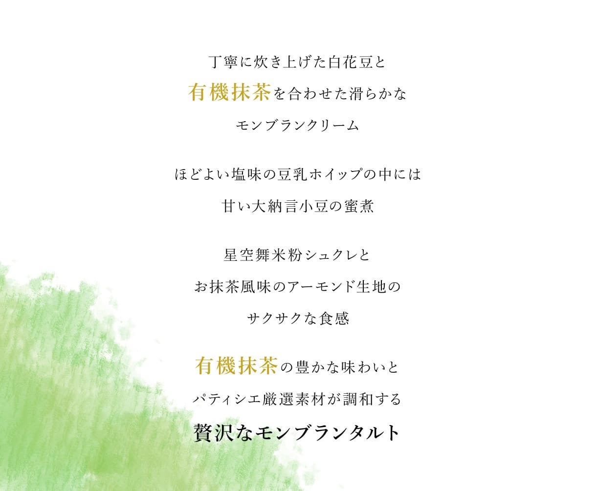 ・有機抹茶の豊かな味わいとパティシエ厳選素材が調和する贅沢なモンブランタルト