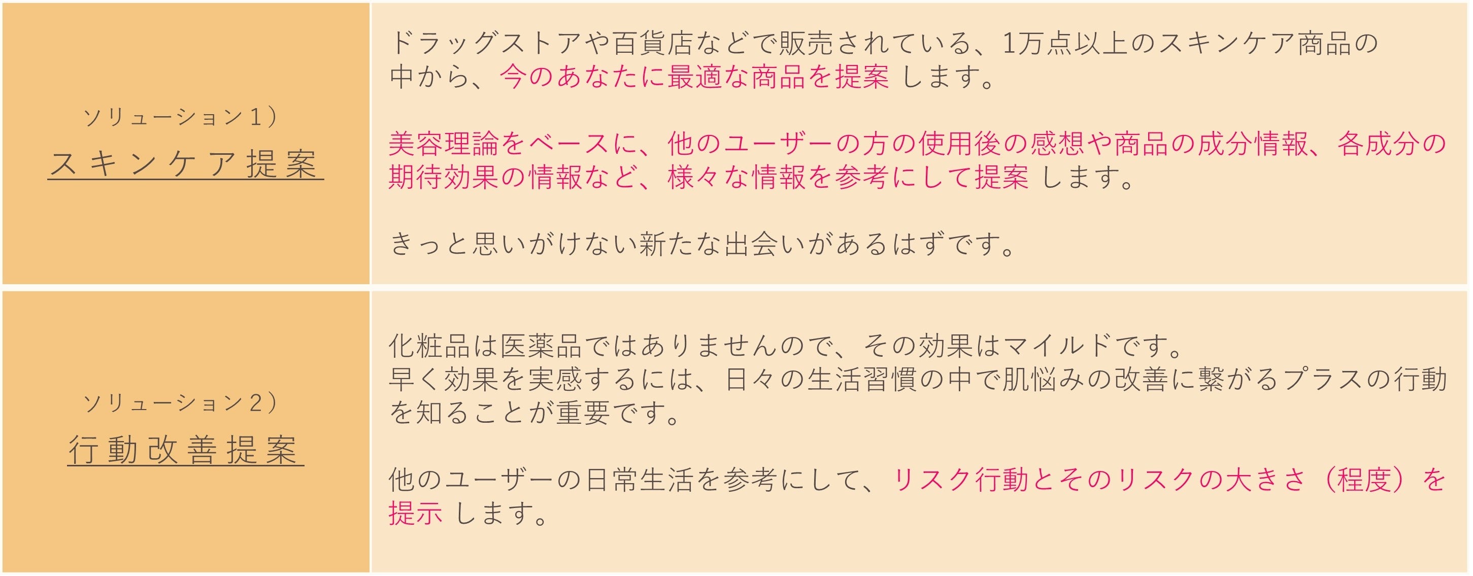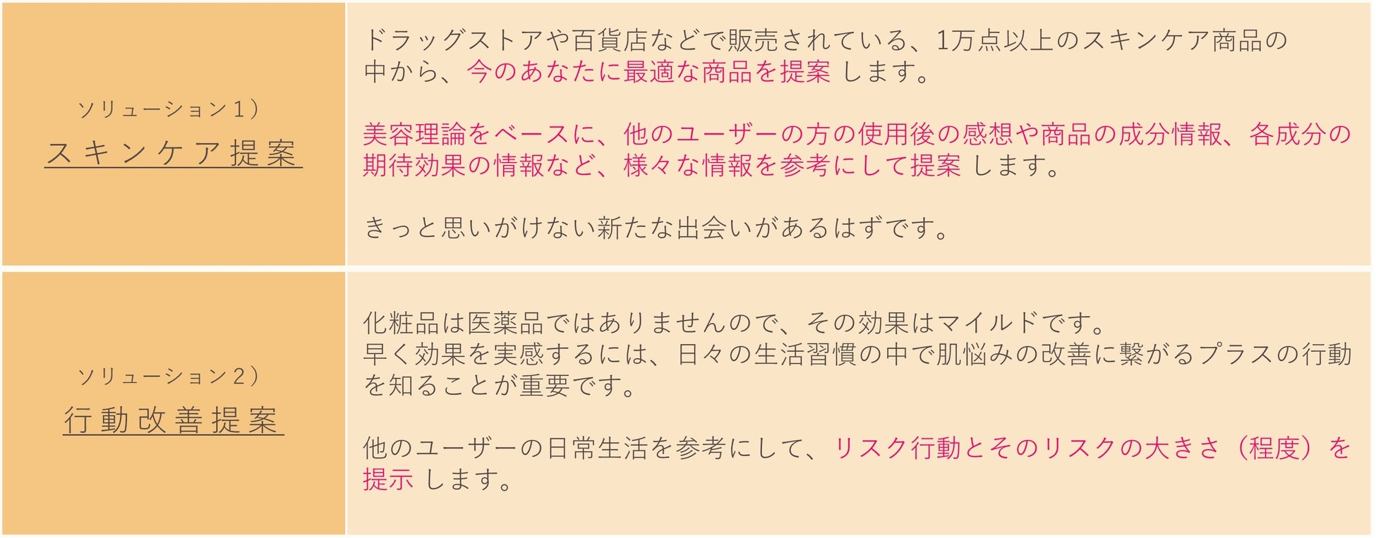 ●スキンケア提案は、商品選択の際に必要となる膨大な情報をベースにしている点に特徴があり、行動改善提案では、日常生活を振り返り、行動変容のきっかけとなる情報を提供しています。