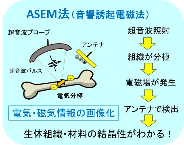 物質は「歪むと電圧が生じる」という圧電効果を有しているため、超音波の音圧を印加すれば同様に多くの物質に電気が発生するだろうと考え、ASEM法の発明に至りました。とくに、骨や腱・靭帯などの生体組織においても圧電効果が観測され、その信号特性がコラーゲン線維の結晶性・配向性と深くかかわっていることを見出してきました。ASEM法は、これまでにない新たな生体情報を可視化しますが、既存の超音波診断機器との親和性が高いため、患者、医療従事者に大きな負担をかけることなく医療現場にメリットをもたらすものと考えております。