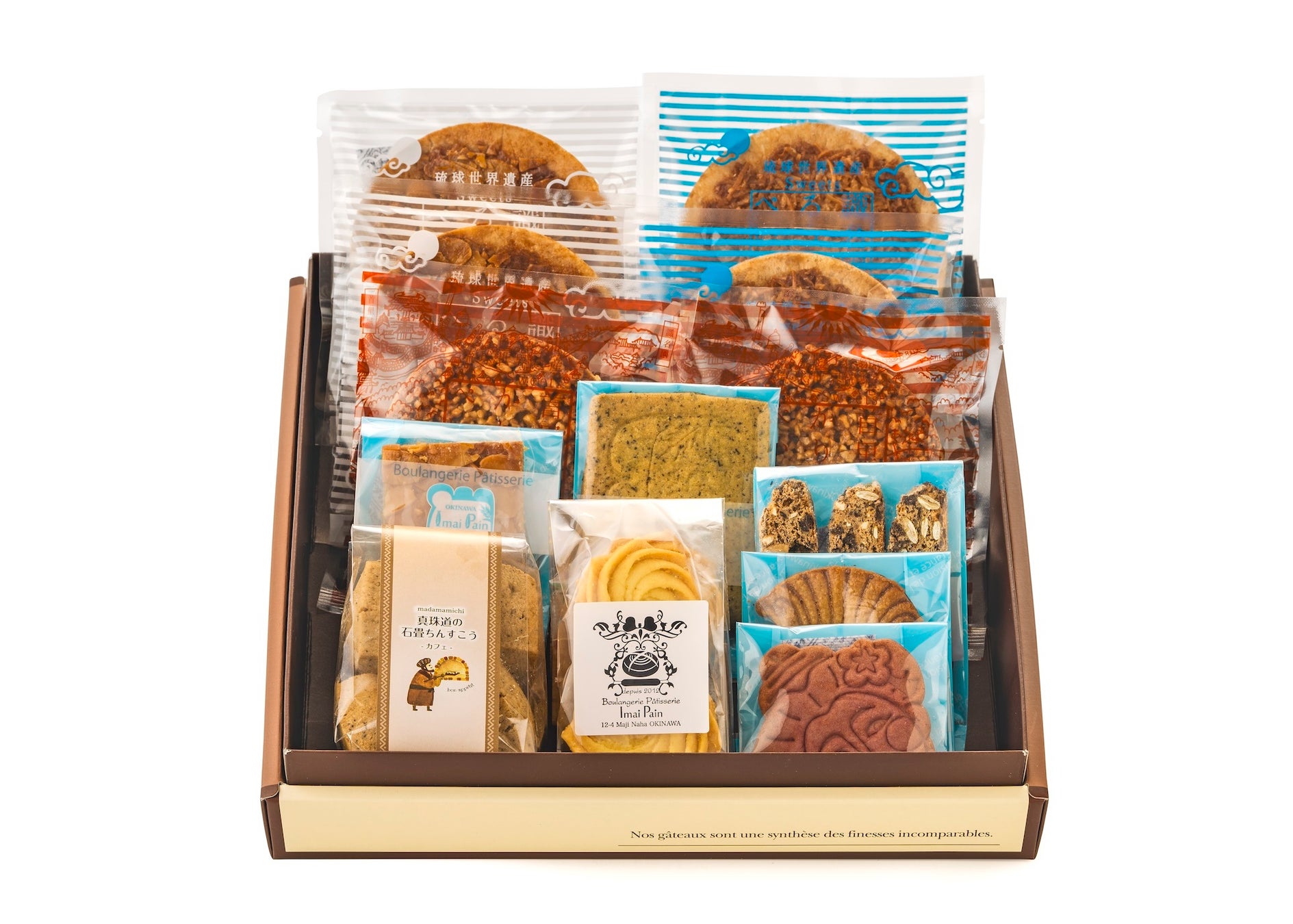 いまいパンの販売する洋菓子は、これまで数々の賞を受けてきました。中でも焼き菓子ギフトの「琉球世界遺産スイーツシリーズ」は、2015年に「識名園 浪漫餅(るうまんぺい)」が那覇市⻑賞優秀賞を受賞したことを皮切りに、2016年には「琉球国王のティータイムクッキー」が、2017年には「⾸⾥城 嘉例餅(かりーぺい)」がそれぞれ同賞を受賞。2017年には「識名園 浪漫餅(るうまんぺい)」が全国菓⼦⼤博覧会名誉総裁賞、「琉球国王のティータイムクッキー」が全国菓⼦⼤博覧会⾦菓賞を受賞しました。